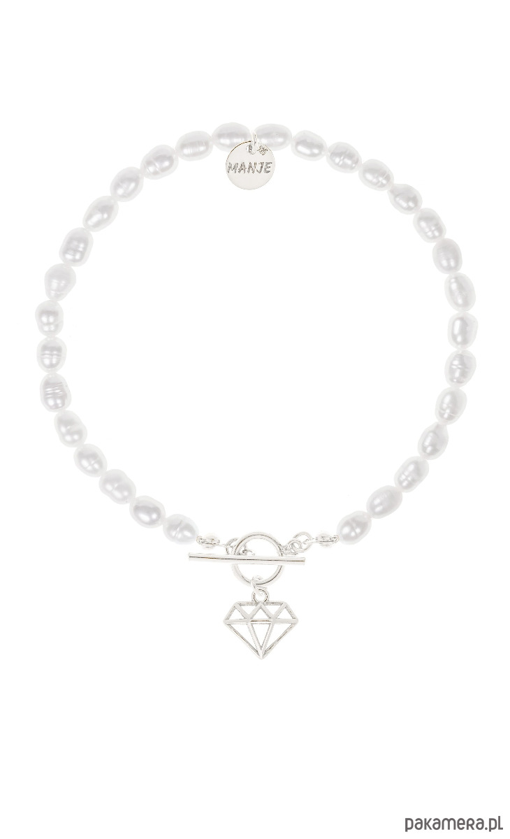 Bransoletka z naturalnych pereł ze srebrnym diamentem. Bransoletka wykonana jest z białych naturalnych pereł hodowlanych. Zawieszka, zapięcie oraz logo wykonane ze srebra próby 925.