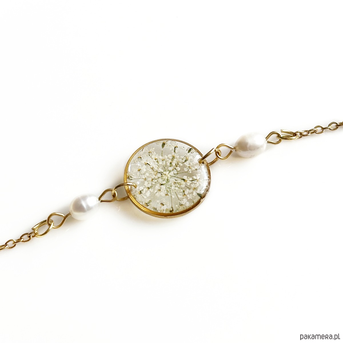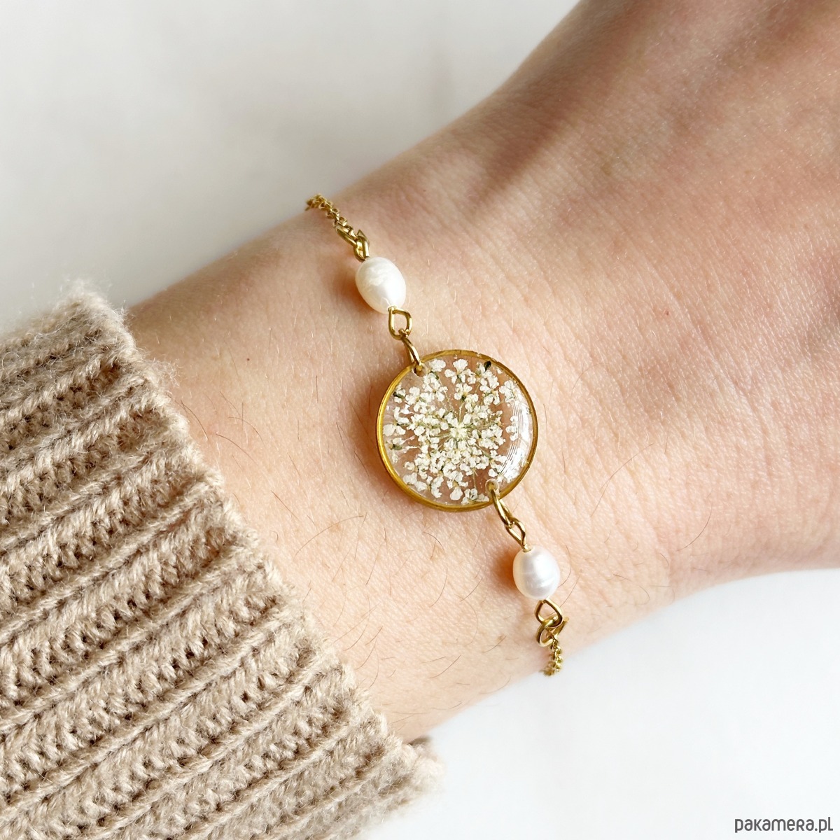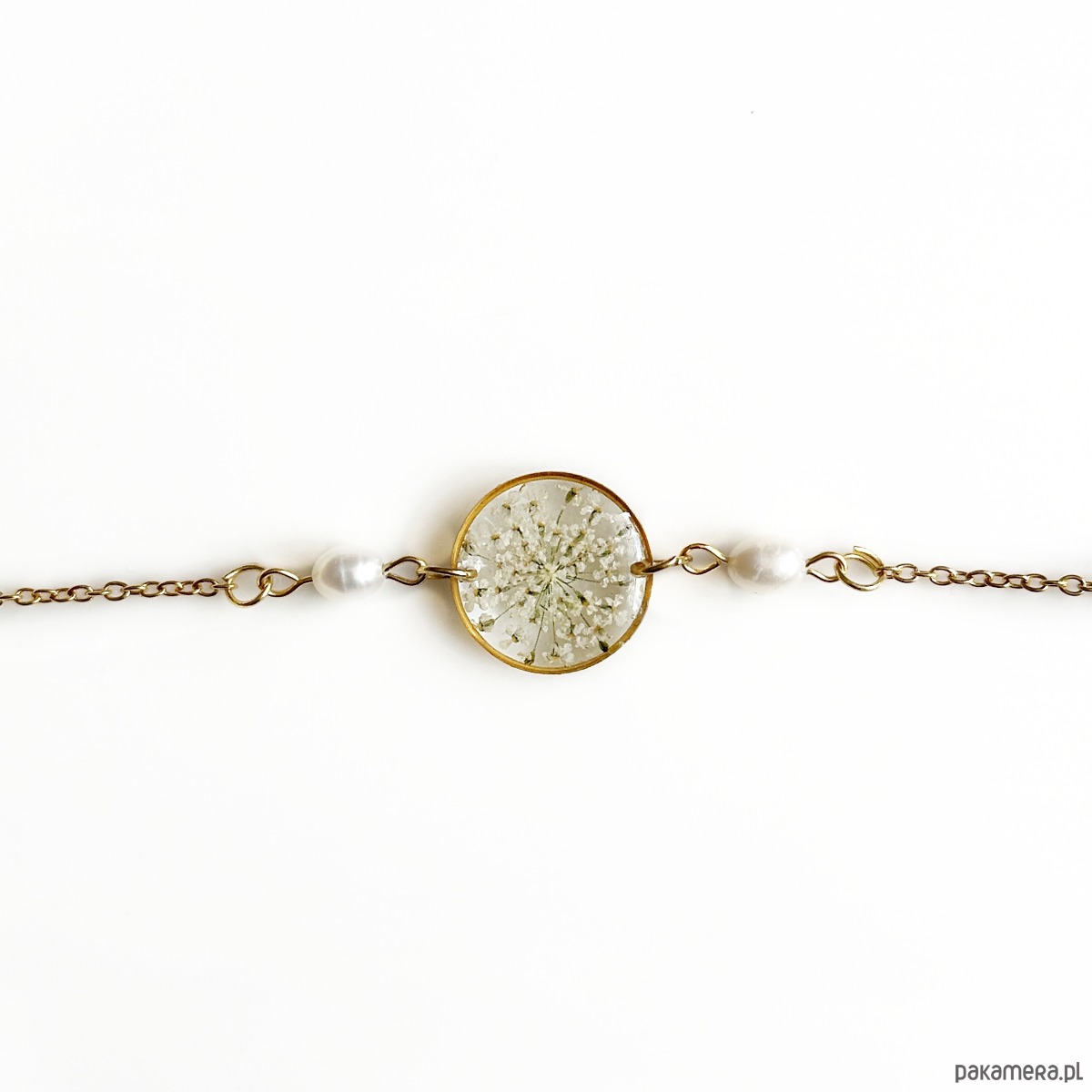 Bransoletka z dziką marchwią jest wykonana ze stali szlachetnej oraz żywicy epoksydowej.