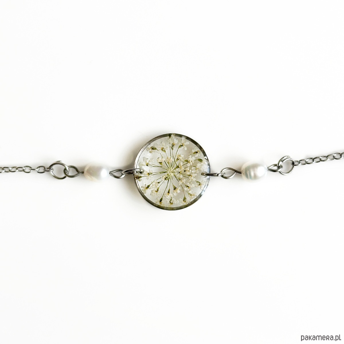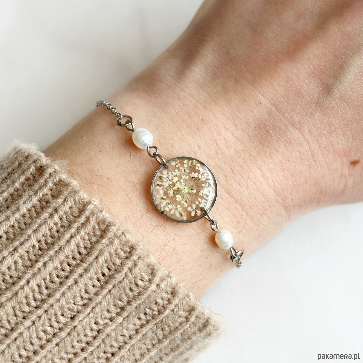 Bransoletka z dziką marchwią jest wykonana ze stali szlachetnej oraz żywicy epoksydowej.