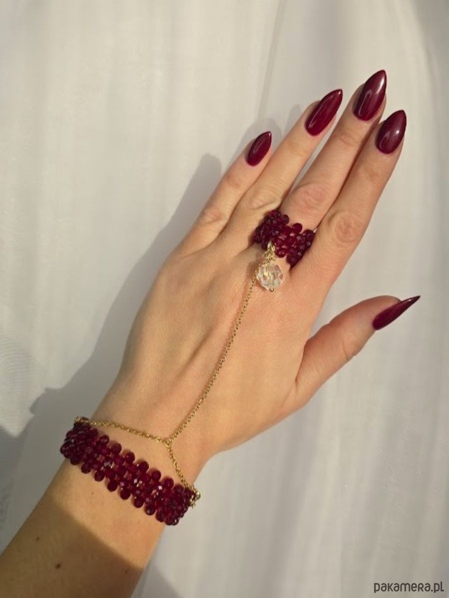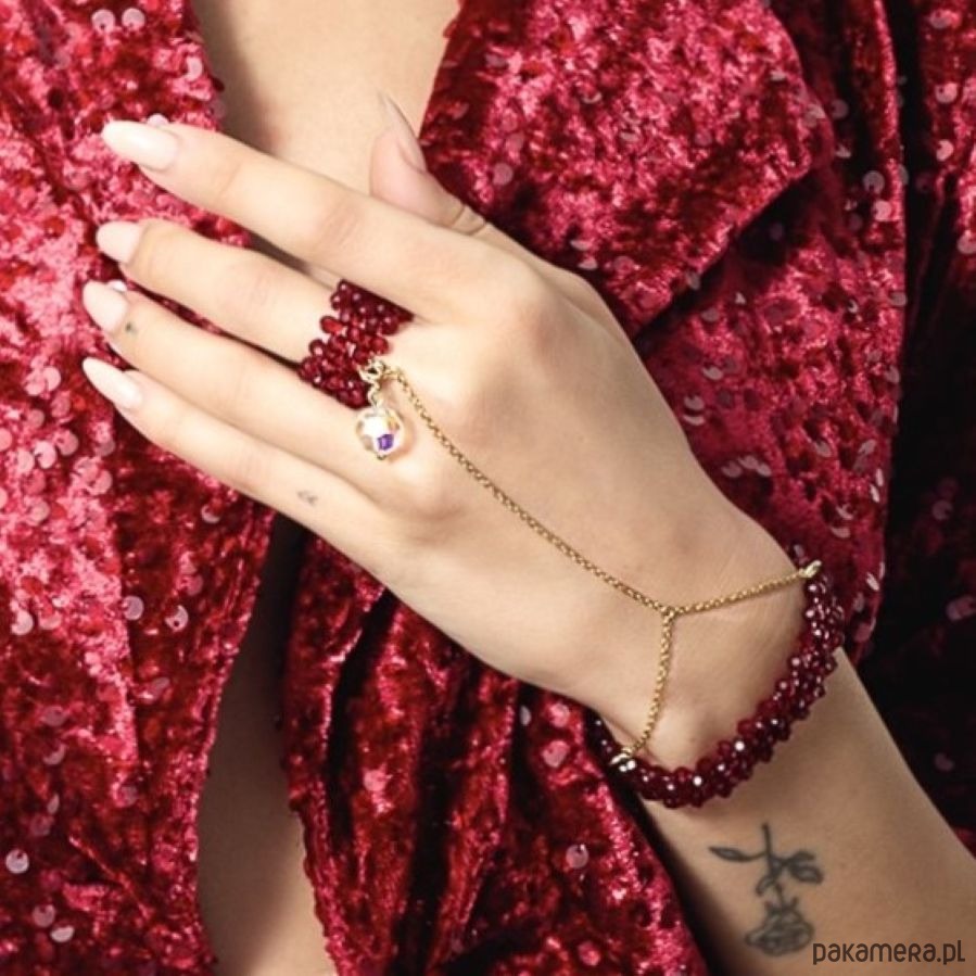 Bransoletka 5-rzędowa ze szkła kryształowego w kolorze burgundowym, z ozdobną zawieszką w postaci kulką kryształu Swarovski lub wypukłego kółeczka – do wyboru. Bransoletka wykonana jest w połączeniu z elementami stali szlachetnej oraz srebra 925 pozłacanego 24k złotem. Zawieszka dopinana jest do bransoletki za pomocą federinga, dzięki czemu można nosić ją w wersji z zawieszką lub bez. Ręcznie pleciona bransoletka nawinięta jest na elastyczną, trwałą gumkę silikonową, dzięki czemu biżuteria dopasowuje się do nadgarstka i pięknie przylega. Kryształki błyszczą pod wpływem światła, co sprawia, że bransoletka prezentuje się okazale i luksusowo.