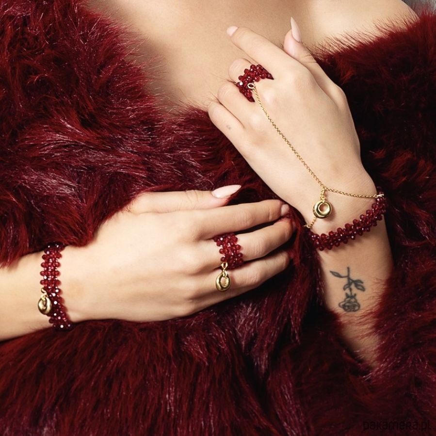 Bransoletka 5-rzędowa ze szkła kryształowego w kolorze burgundowym, z ozdobną zawieszką w postaci wypukłego kółeczka. Bransoletka wykonana jest w połączeniu z elementami stali szlachetnej oraz srebra 925 pozłacanego 24k złotem. Zawieszka dopinana jest do bransoletki za pomocą federinga, dzięki czemu można nosić ją w wersji z zawieszką lub bez. Ręcznie pleciona bransoletka nawinięta jest na elastyczną, trwałą gumkę silikonową, dzięki czemu biżuteria dopasowuje się do nadgarstka i pięknie przylega. Kryształki błyszczą pod wpływem światła, co sprawia, że bransoletka prezentuje się okazale i luksusowo.