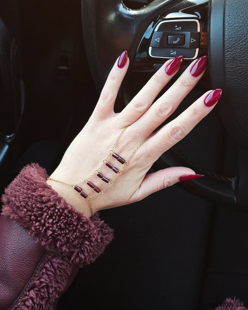 Bransoletka z pierścionkiem z burgundowych kamieni granatu w kształcie słupków, wykonana w połączeniu z łańcuszkiem oraz elementami ze stali szlachetnej/chirurgicznej pozłacanej. Bransoletka zapinana jest na karabińczyk z możliwością regulacji, dzięki dodatkowej przedłużce (+5 c), z logo Afroditte na jej końcu. Regulacja umożliwia dopasowanie bransoletki do dłoni. Nieregularne słupki nadają naturalności biżuterii, a wzór bransoletki subtelnie podkreśla dłoń i dodaje wyglądowi zmysłowości.