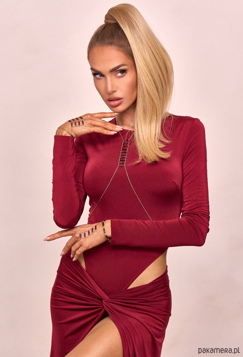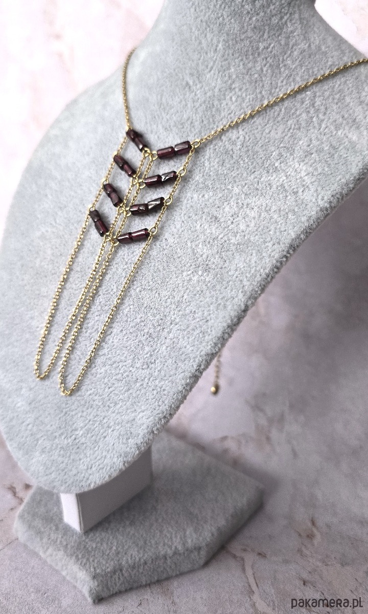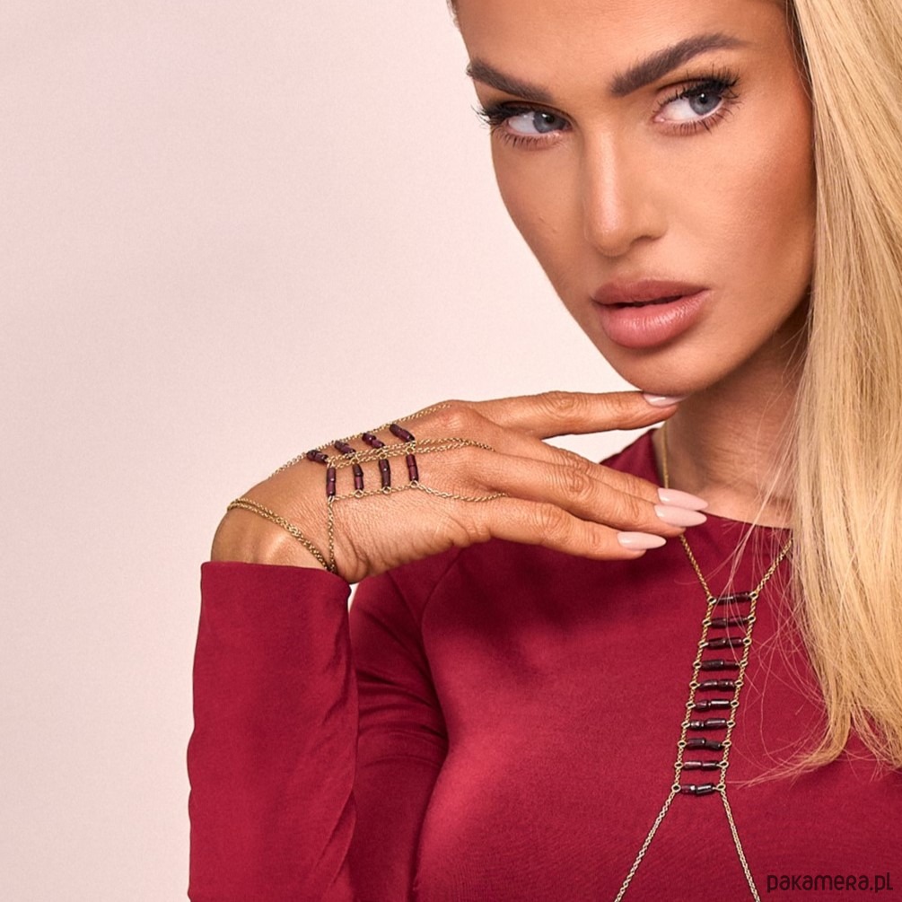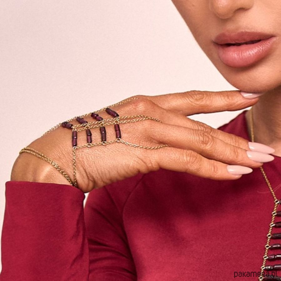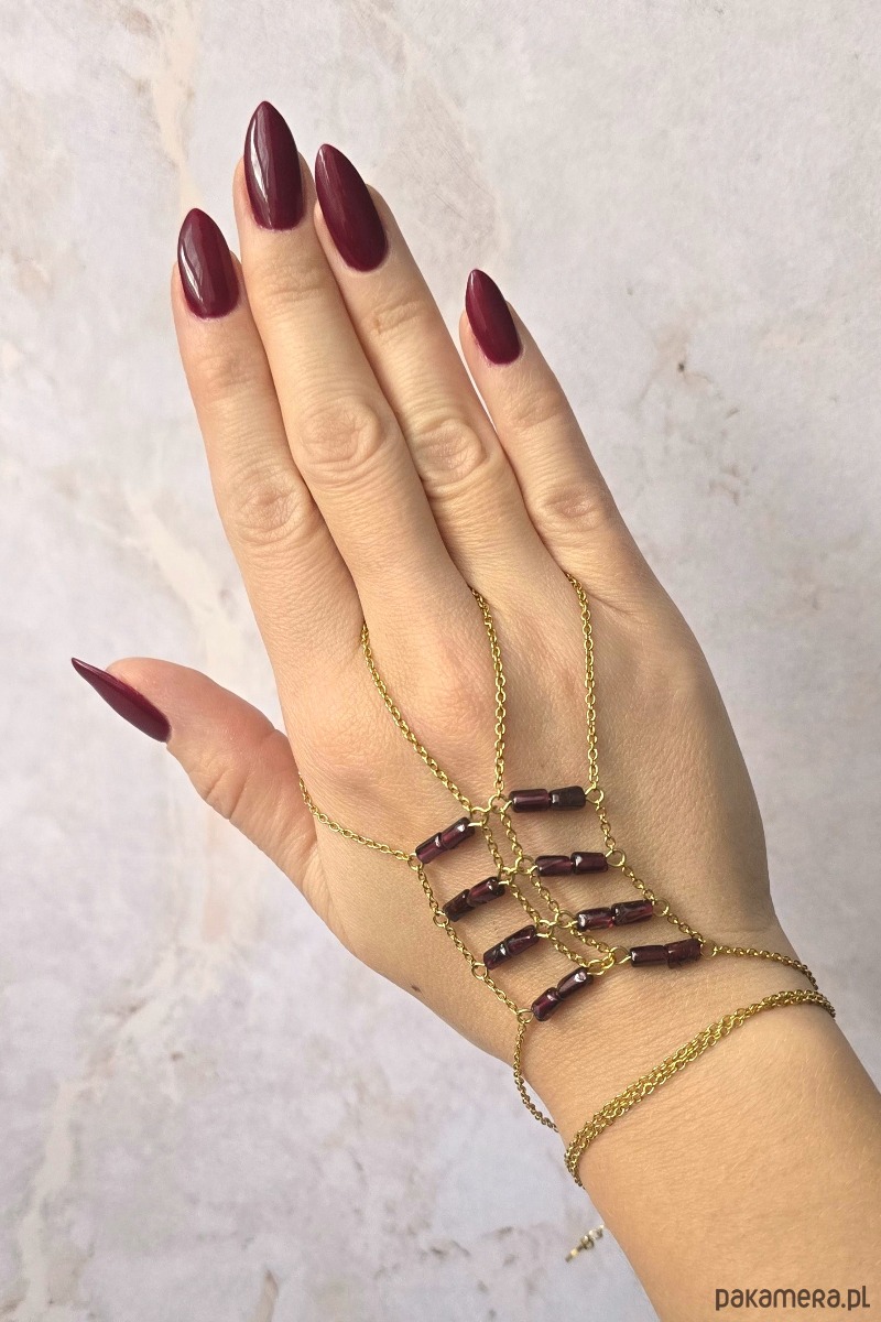 Bransoletka z pierścionkiem z burgundowych kamieni granatu w kształcie słupków, ułożonych na dłoni w 2 rzędy, wykonana w połączeniu z łańcuszkiem oraz elementami ze stali szlachetnej/chirurgicznej pozłacanej. Bransoletka zapinana jest na karabińczyk z możliwością regulacji, dzięki dodatkowej przedłużce (+5 c), z logo Afroditte na jej końcu. Regulacja umożliwia dopasowanie bransoletki do dłoni. Nieregularne słupki nadają naturalności biżuterii, a wzór bransoletki subtelnie podkreśla dłoń i dodaje wyglądowi zmysłowości.