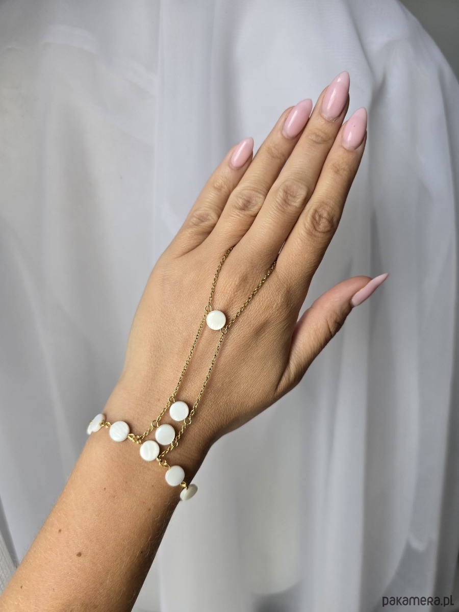 Bransoletka z pierścionkiem z pastylek masy perłowej w kolorze bieli, wykonana w połączeniu z elementami stali szlachetnej/chirurgicznej. Bransoletka zapinana jest karabińczyk, z możliwością regulacji dzięki dodatkowej przedłużce (+5 cm). Łańcuszek ze stali pozłacanej jest odporny na ścieranie. Bransoletka pięknie podkreśla dłoń i nadaje charakteru stylizacji.