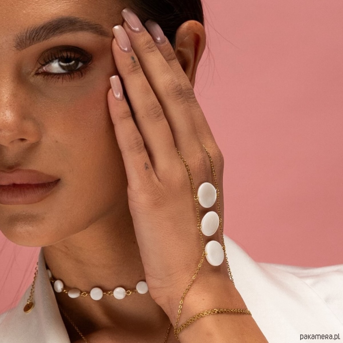 Bransoletka z pierścionkiem łańcuszkowa z 3 dużymi pastylkami, wykonana ze stali szlachetnej oraz dodatkiem kółeczek łączących z mosiądzu pozłacanego 14-karatowym złotem. Pierścionek z łańcuszka zakładany jest na palec (dopasowany rozmiarowo do bransoletki). Bransoletka zapinana jest na karabińczyk, z możliwością regulacji dzięki dodatkowej przedłużce (+ 5 cm), z logo Afroditte na jej końcu. Łańcuszek wokół nadgarstka owijany jest podwójnie, dzięki czemu bransoletka ma zastosowanie 2w1, tzn. można nosić ją również w formie łańcuszka szyję. Piękny wzór dużych pastylek sprawia, że bransoletka prezentuje się wyraziście, elegancko i z klasą, a jednocześnie doskonale dopasuje się do stylizacji boho.