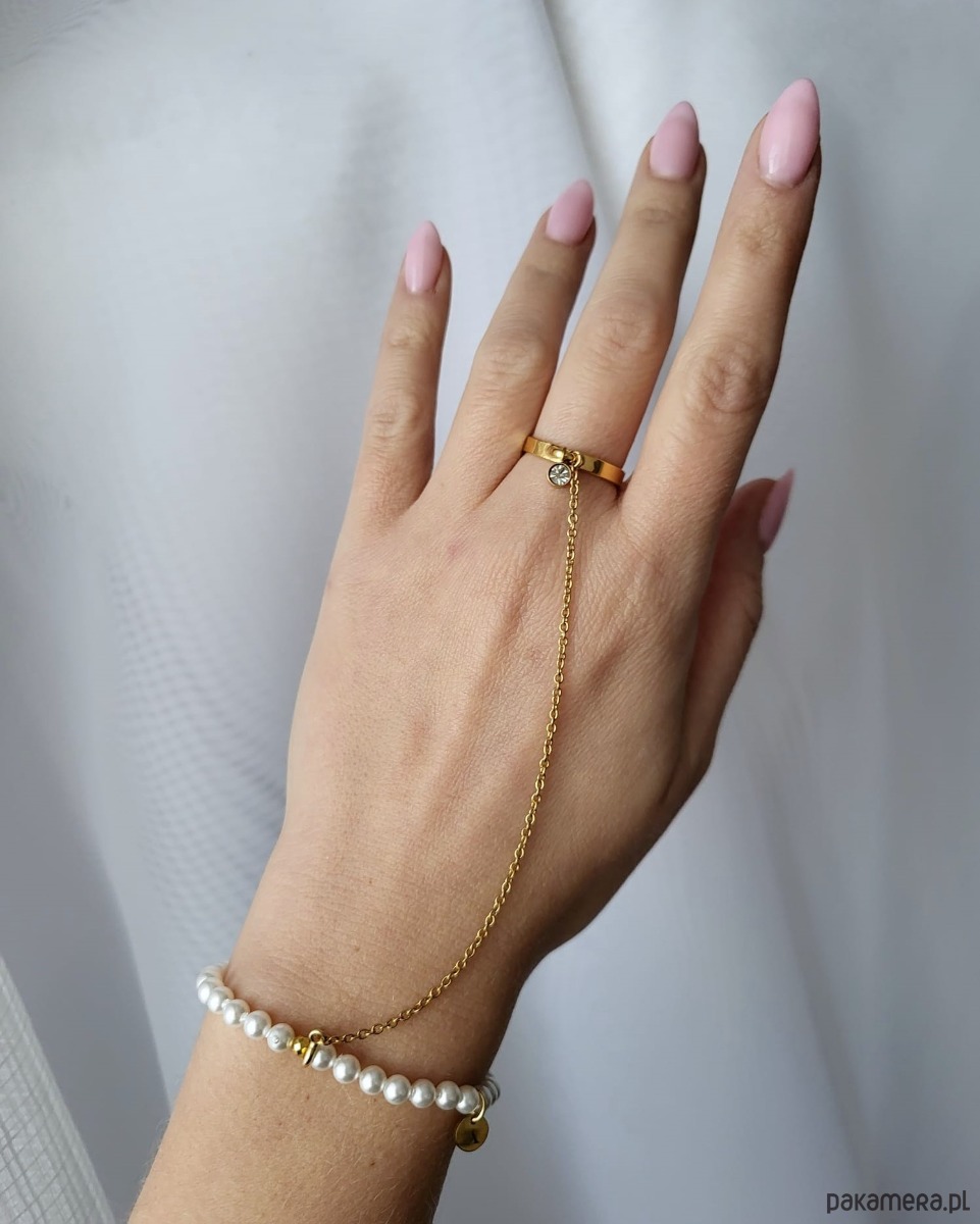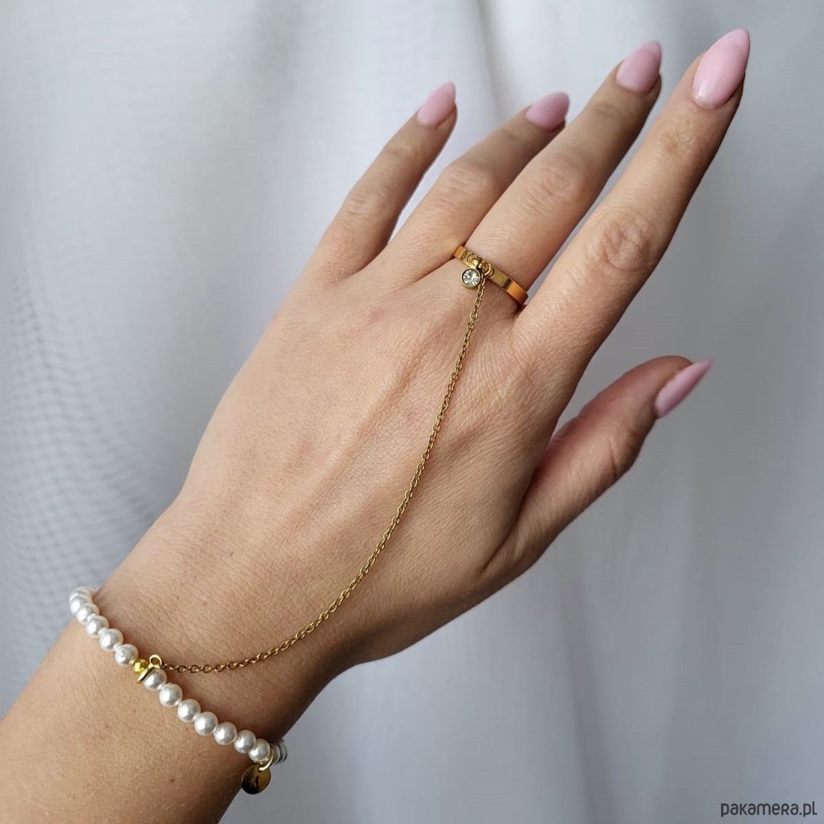 Bransoletka z pierścionkiem z perły muszlowej wykonana w połączeniu z wysokiej jakości srebra 925 pozłacanego 24-karatowym złotem (obrączka) oraz stali szlachetnej. Pierścionek posiada ozdobną zawieszkę w postaci cyrkonii w okuciu ze stali szlachetnej. Pierścionek z łańcuszkiem dopinany jest do bransoletki za pomocą federinga, dzięki czemu bransoletkę można nosić również w standardowej wersji bez pierścionka. Perełki (4 mm) nawleczone są na elastyczną, trwałą gumkę silikonową. Bransoletka posiada zawieszkę logo Afroditte. Całość prezentuje się bardzo elegancko i luksusowo, a łańcuszek łączący bransoletkę z pierścionkiem pięknie podkreśla dłoń, co nadaje biżuterii zmysłowości.
