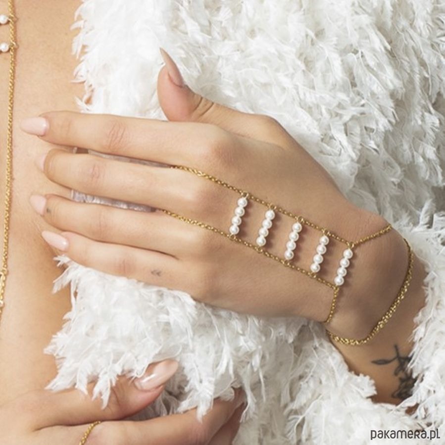 Bransoletka z pierścionkiem z białych pereł muszlowych w kształcie kuleczek, wykonana w połączeniu z łańcuszkiem oraz elementami ze stali szlachetnej/chirurgicznej pozłacanej. Bransoletka zapinana jest na karabińczyk z możliwością regulacji, dzięki dodatkowej przedłużce (+5 c), z logo Afroditte na jej końcu. Regulacja umożliwia dopasowanie bransoletki do dłoni. Klasyczne kuleczki perełek nadają biżuterii ponadczasowości i klasy, a nowoczesny wzór bransoletki subtelnie podkreśla dłoń oraz dodaje wyglądowi zmysłowości i stylu.
