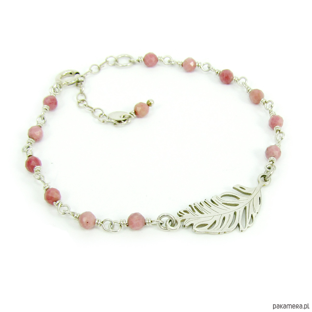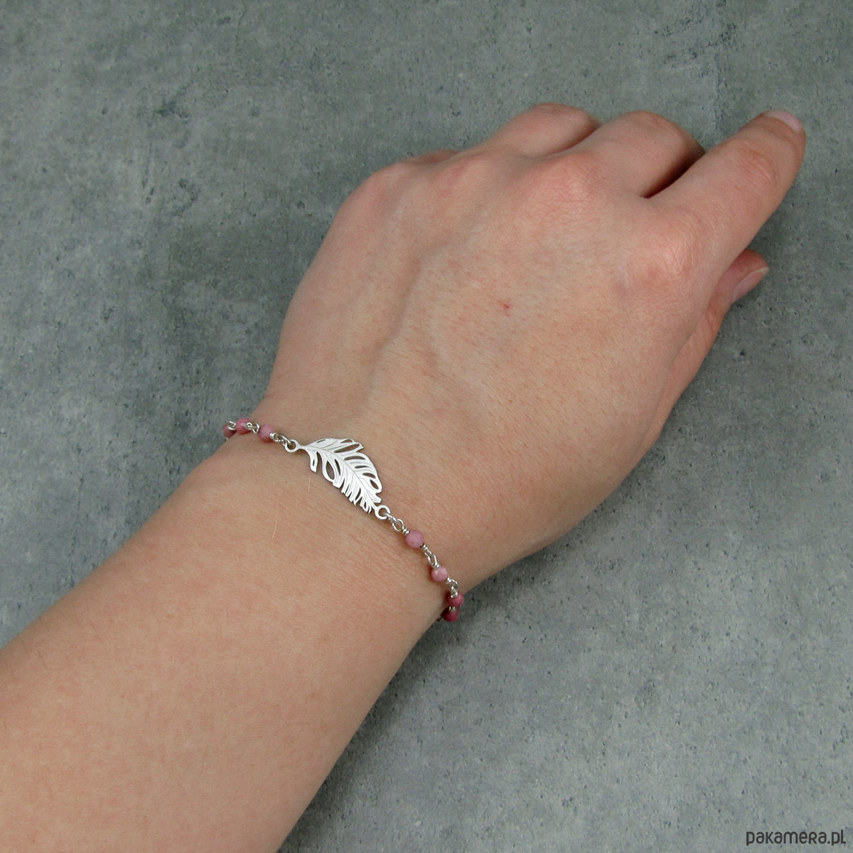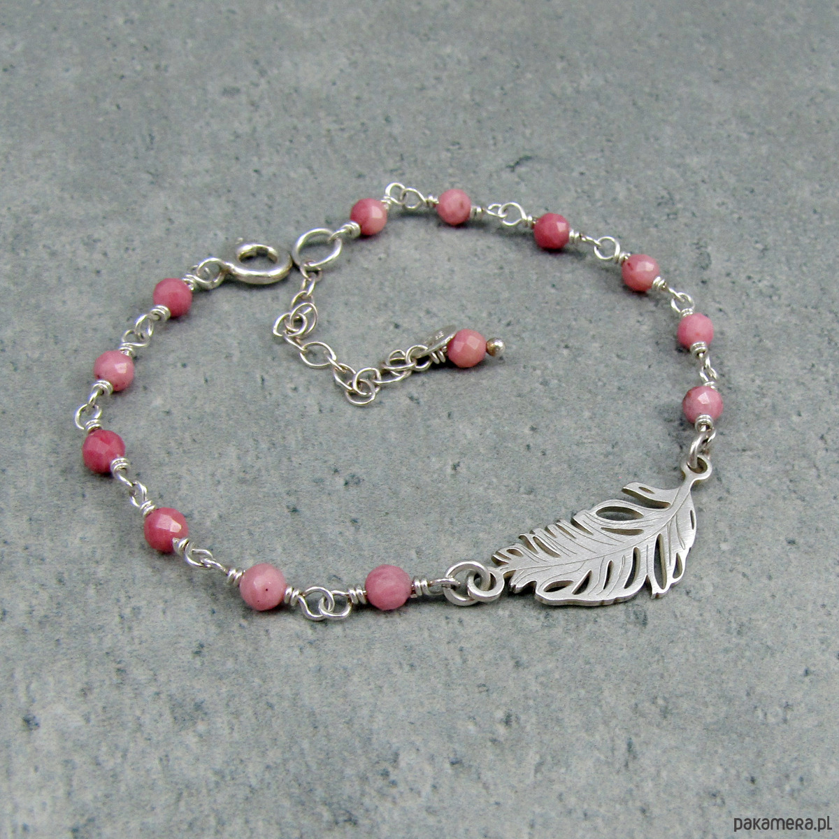 Delikatna, dziewczęca, wręcz eteryczna bransoletka ze srebrnym piórkiem. Subtelny dodatek w pastelowych kolorach, który świetnie będzie pasował do letniej sukienki. Idealna na prezent dla romantyczki. Wykonałam ją ze srebra próby 925, a także z fasetowanych kuleczek rodonitu w kolorze stonowanego różu. Szerokość bransoletki w najszerszym miejscu to ok. 1 cm, kamyczki mają średnicę ok 4 mm, a długość bransoletki to ok. 15,3 cm + 3,5 cm łańcuszka regulacyjnego. Biżuterię wysyłam zapakowaną w eleganckie pudełeczko.