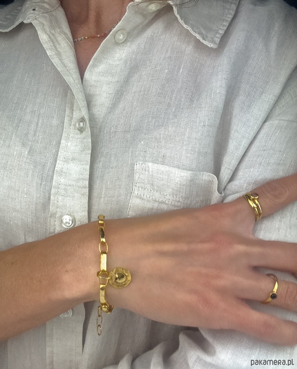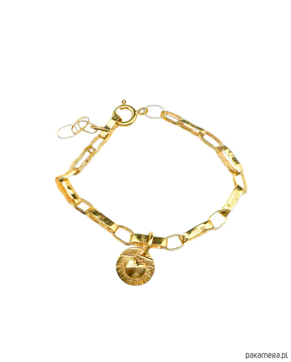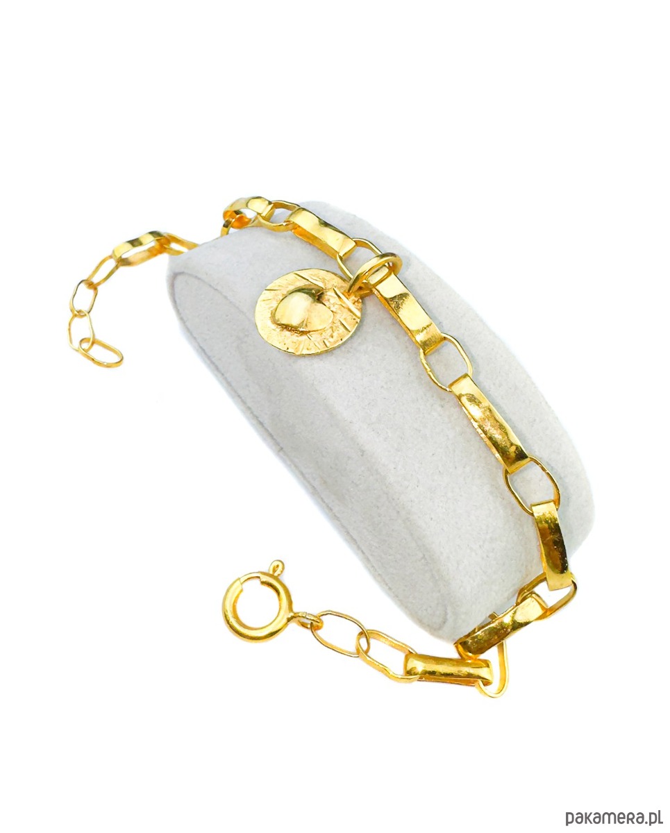 Bransoletka łańcuch z płaskimi, owalnymi ogniwami i zawieszką, blaszką z motywem serca. Całość wykonana od podstaw ręcznie ze srebra 925. Złocona 24 k złotem. Zapięcie - klasyczny federing.