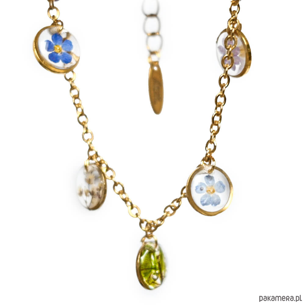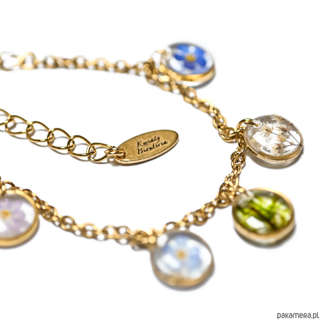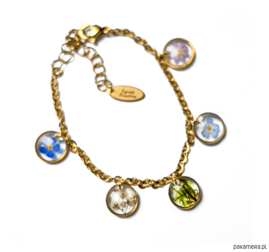Złota bransoletka ze stali chirurgicznej z pięcioma oczkami, w których zatopione są prawdziwe kwiaty – m.in. niezapominajki i mech. Ręcznie tworzona: sieję, zbieram, suszę i zatapiam kwiaty w żywicy, następnie szlifuję i obrabiam. Na końcu bransoletki charms z grawerem mojej marki.