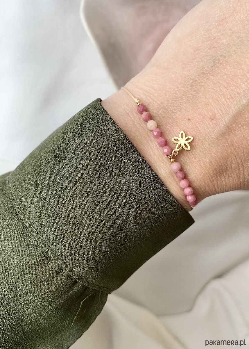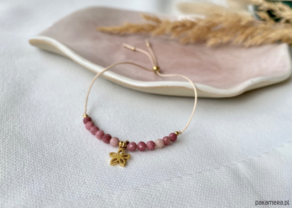Każda bransoletka z rodonitem i kwiatuszkiem została wykonana z ogromną dbałością o detale. Beżowy sznureczek jubilerski jest trwały, miękki i przyjemny w dotyku, dzięki czemu biżuteria jest niezwykle komfortowa w noszeniu. Zapięcie w formie stalowej kuleczki z silikonem umożliwia łatwe dopasowanie rozmiaru do nadgarstka, a jednocześnie jest praktyczne i estetyczne.