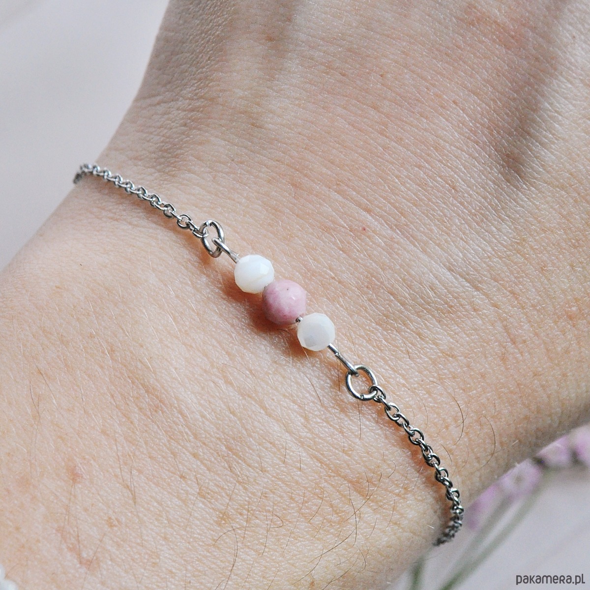 Delikatna bransoletka z rodonitem i masą perłową.