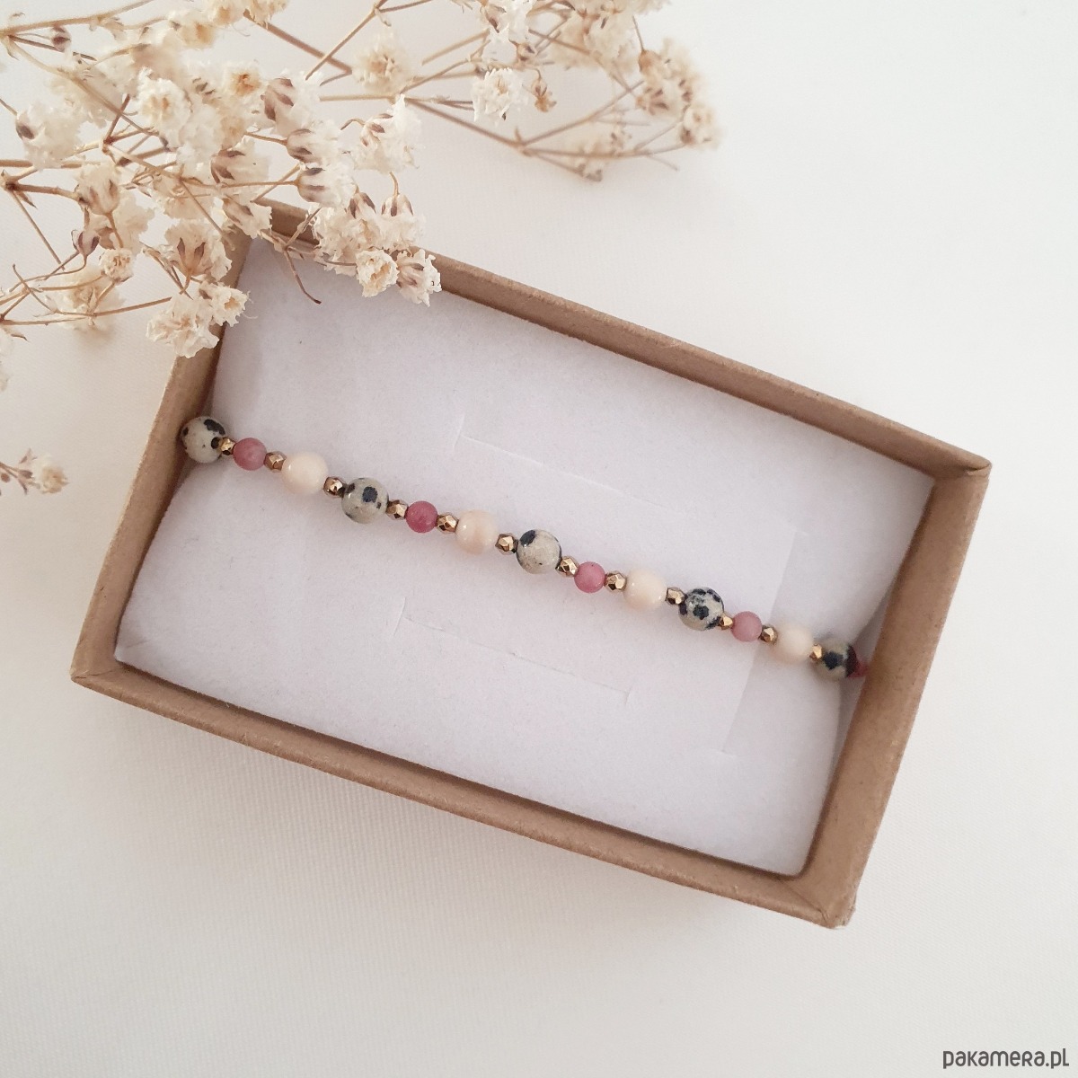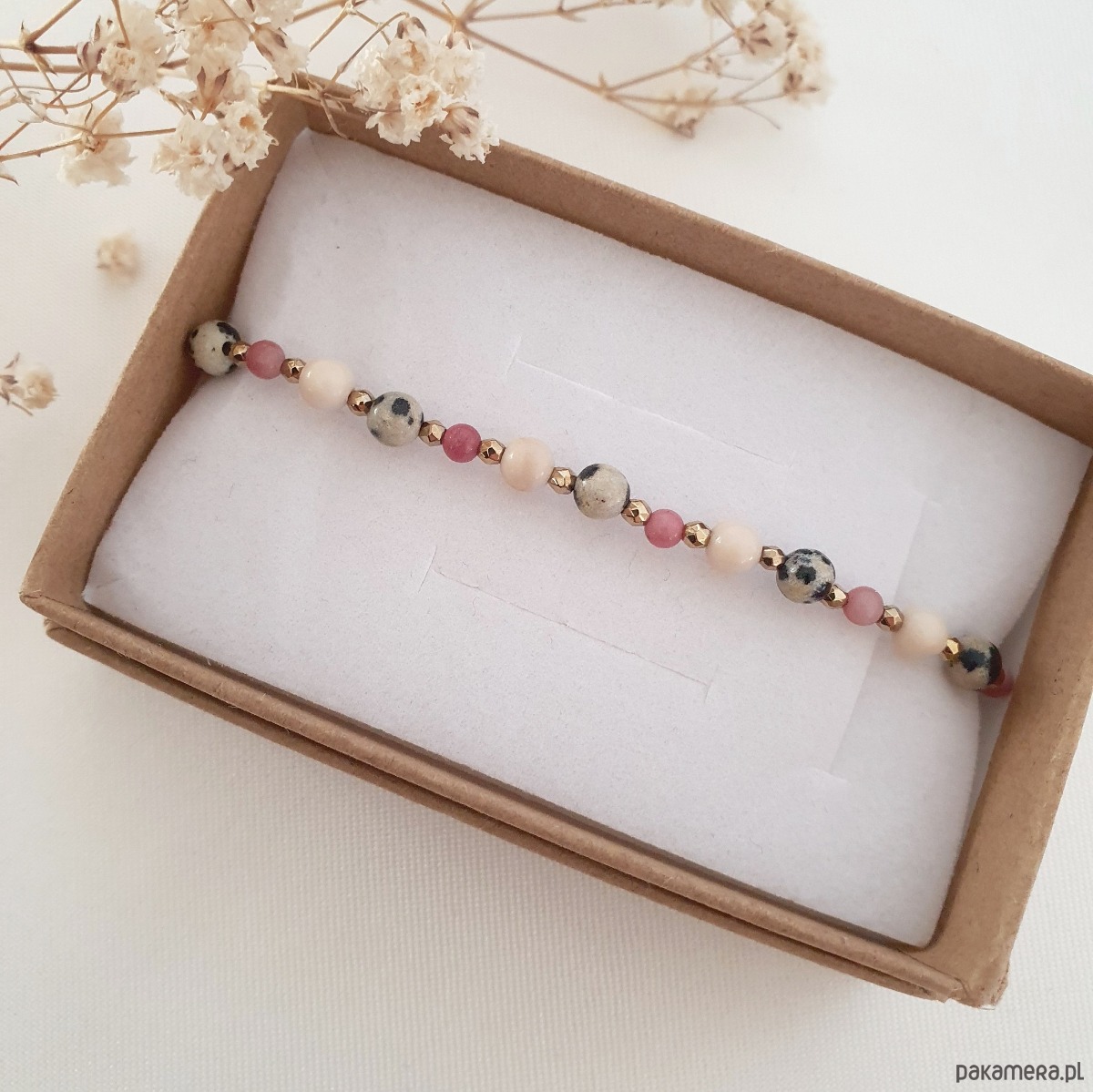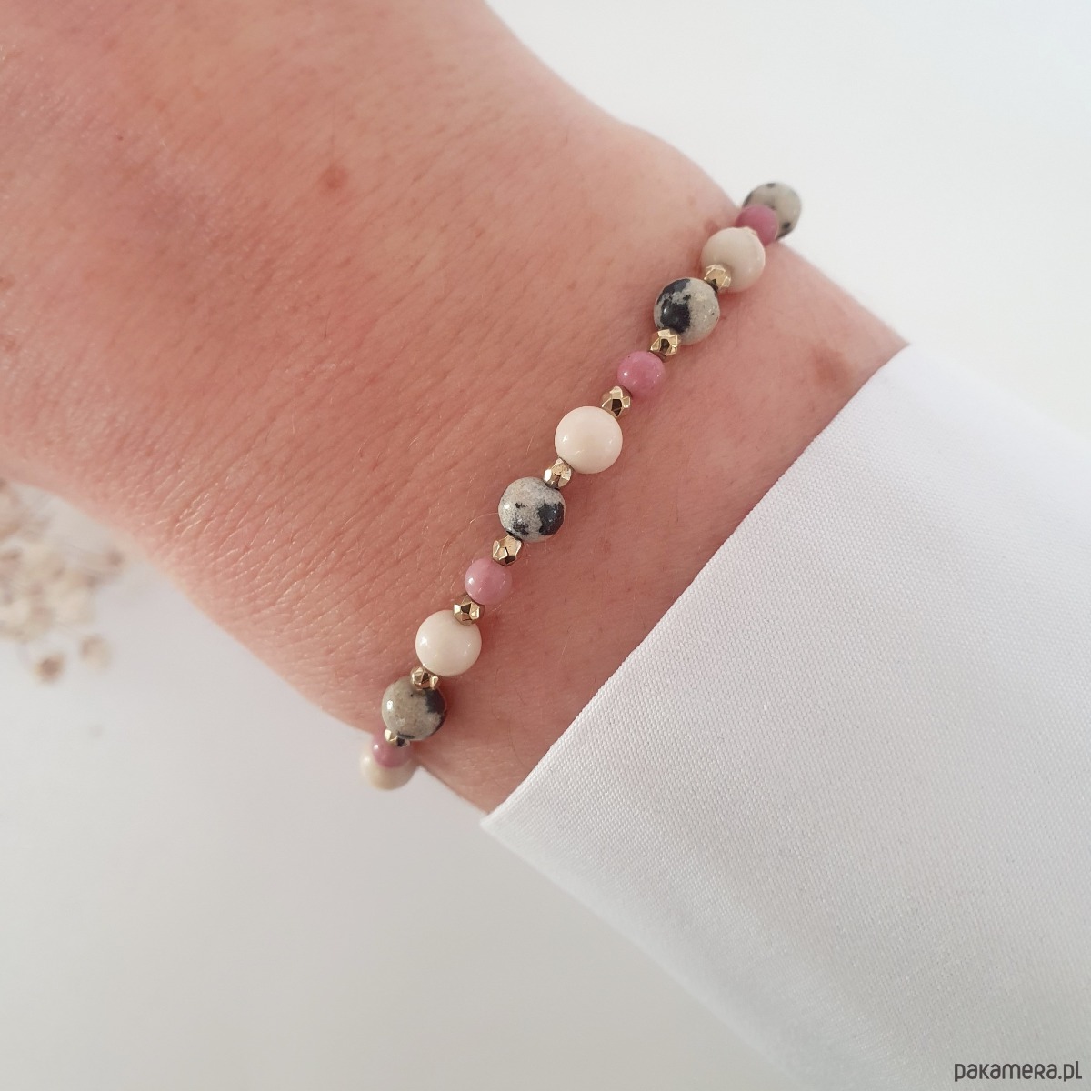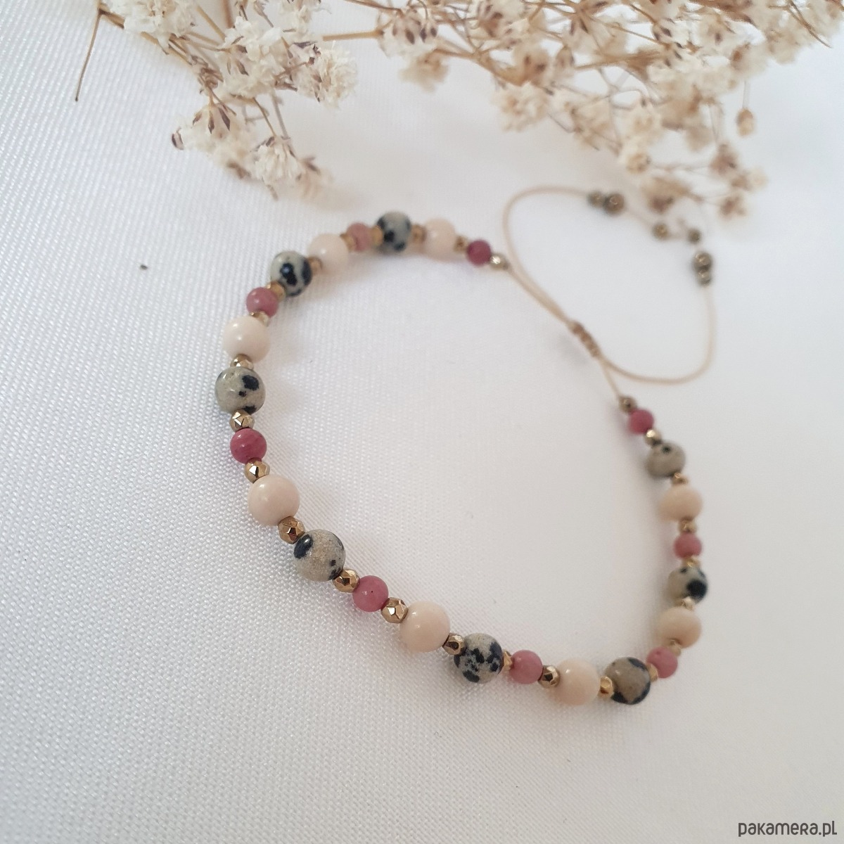 Bransoletka na wytrzymałej nici jubilerskiej z kamieniami: RODONITEM, KAMIENIEM RZECZNYM, JASPISEM DALMATYŃSKIM i hematytem. Regulowane zapięcie pozwala na dowolne dopasowanie do nadgarstka.