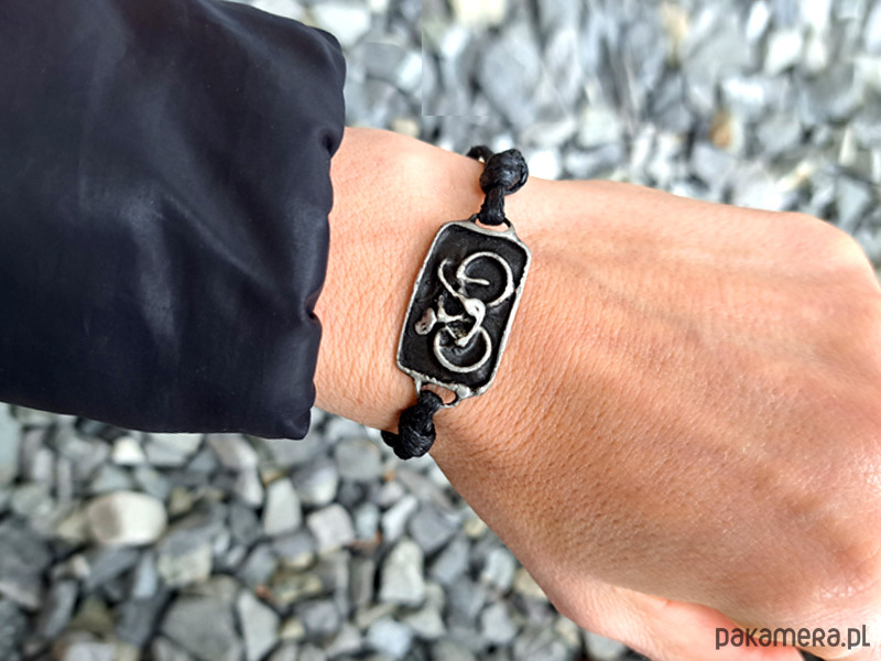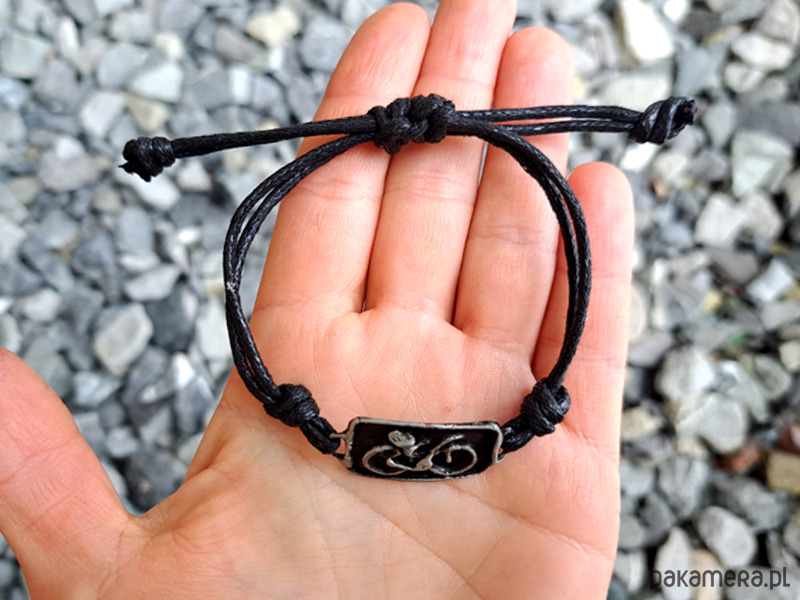 Bransoletka wykończona jest czarnym sznurkiem, dzięki któremu jej obwód jest regulowany.
