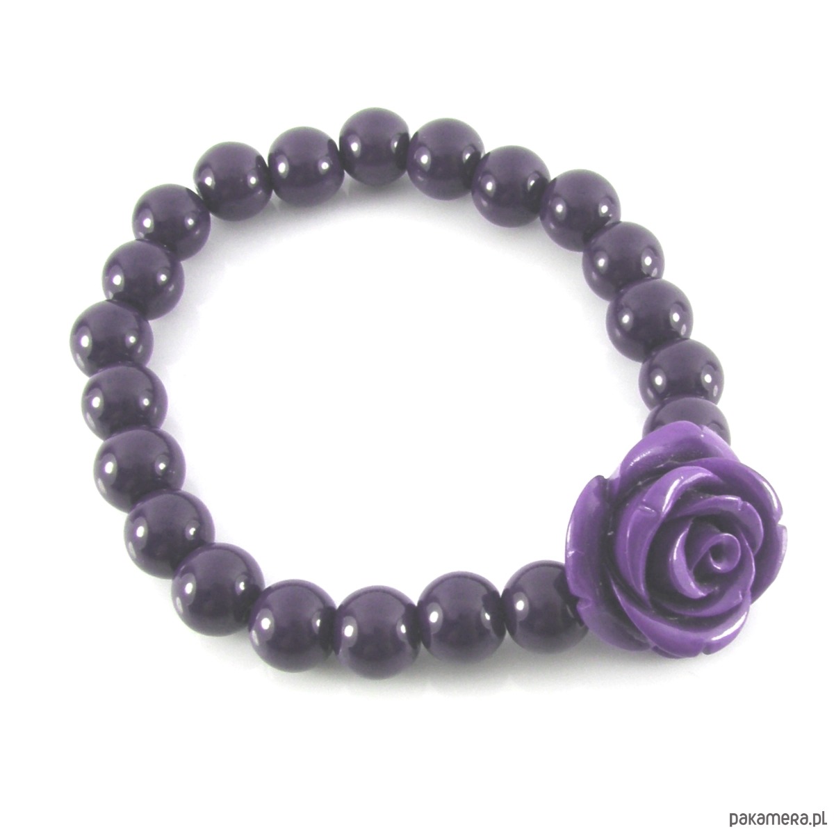 Bransoletka ze szklanych, fioletowych koralików ozdobiona różą z żywicy w kolorze fioletu. Wielkość róży to 2 cm.