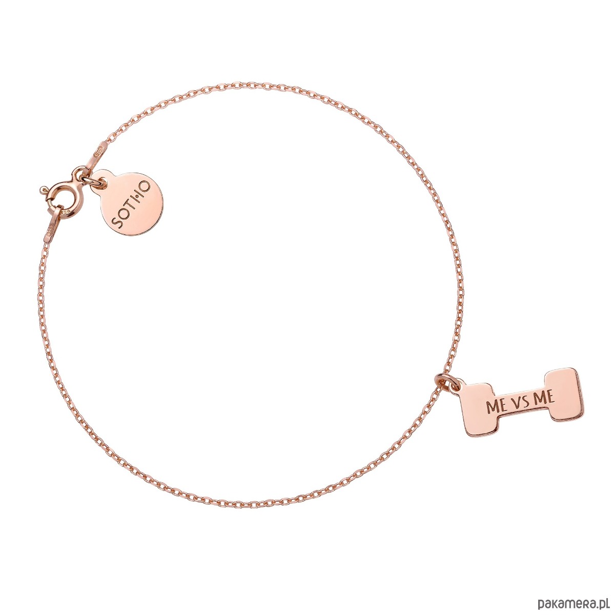 Złota bransoletka łańcuszkowa zdobiona ciężarkiem i zawieszką z logo marki. Całość wykonana ze srebra 925 powlekanego 18 karatowym różowym złotem.