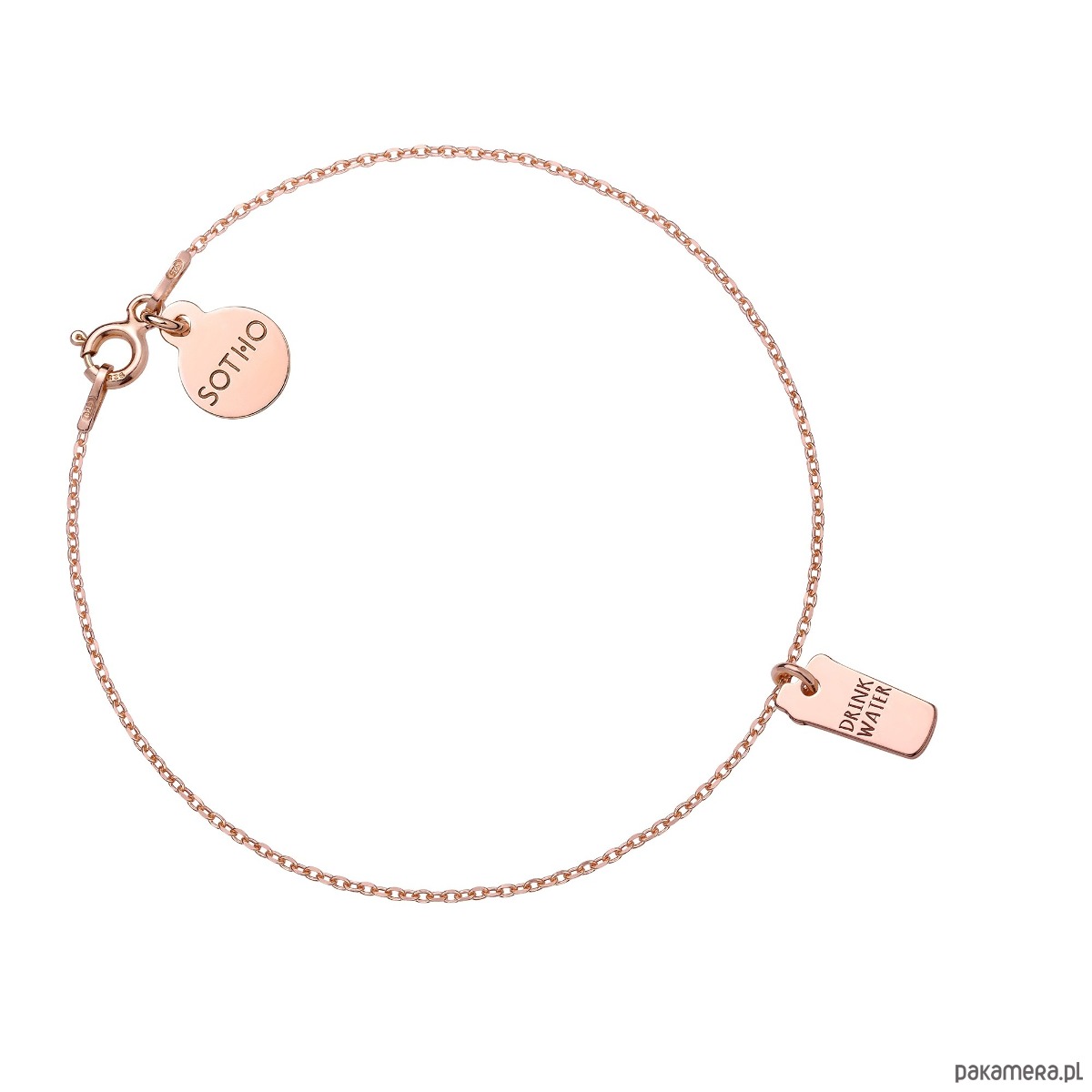 Złota bransoletka łańcuszkowa zdobiona shakerem i zawieszką z logo marki. Całość wykonana ze srebra 925 powlekanego 18 karatowym różowym złotem.