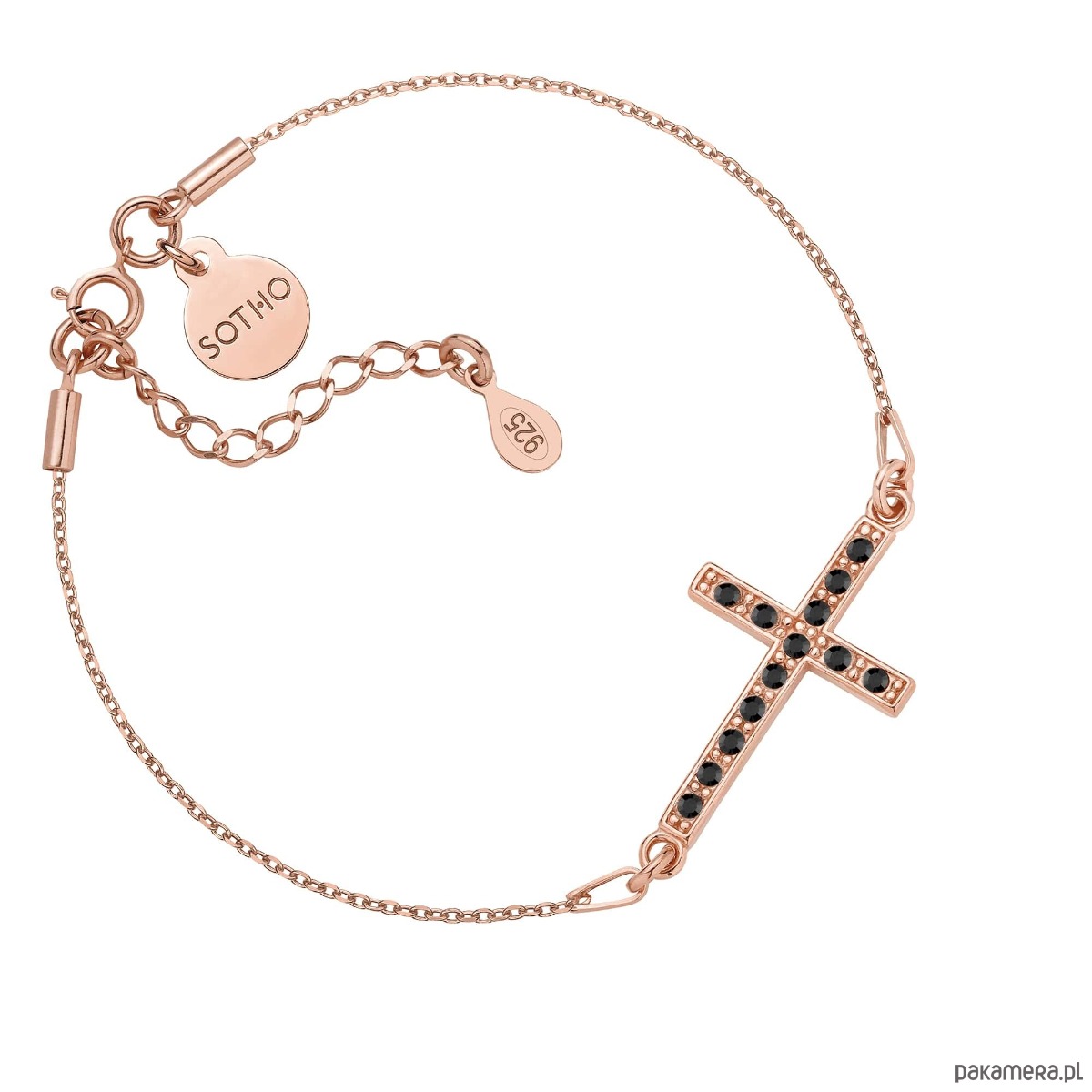 Złota bransoletka łańcuszkowa zdobiona krzyżem wysadzanym czarnymi kryształami SWAROVSKI® CRYSTAL w kolorze Jet i zawieszką z logo marki. Całość wykonana ze srebra 925 powlekanego 18 karatowym różowym złotem.