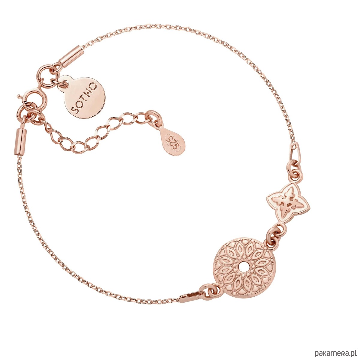 Złota bransoletka łańcuszkowa zdobiona rozetką i medalionem i zawieszką z logo marki. Całość wykonana ze srebra 925 powlekanego 18 karatowym różowym złotem.