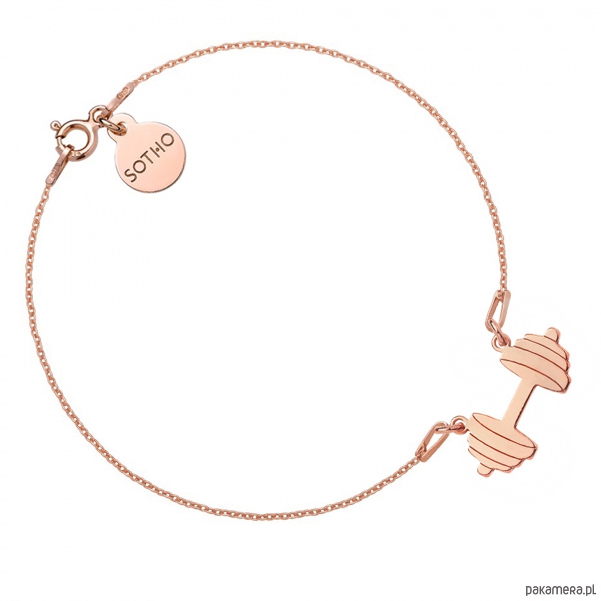 Złota bransoletka łańcuszkowa zdobiona sztangą i zawieszką z logo marki. Całość wykonana ze srebra 925 powlekanego 18 karatowym różowym złotem.