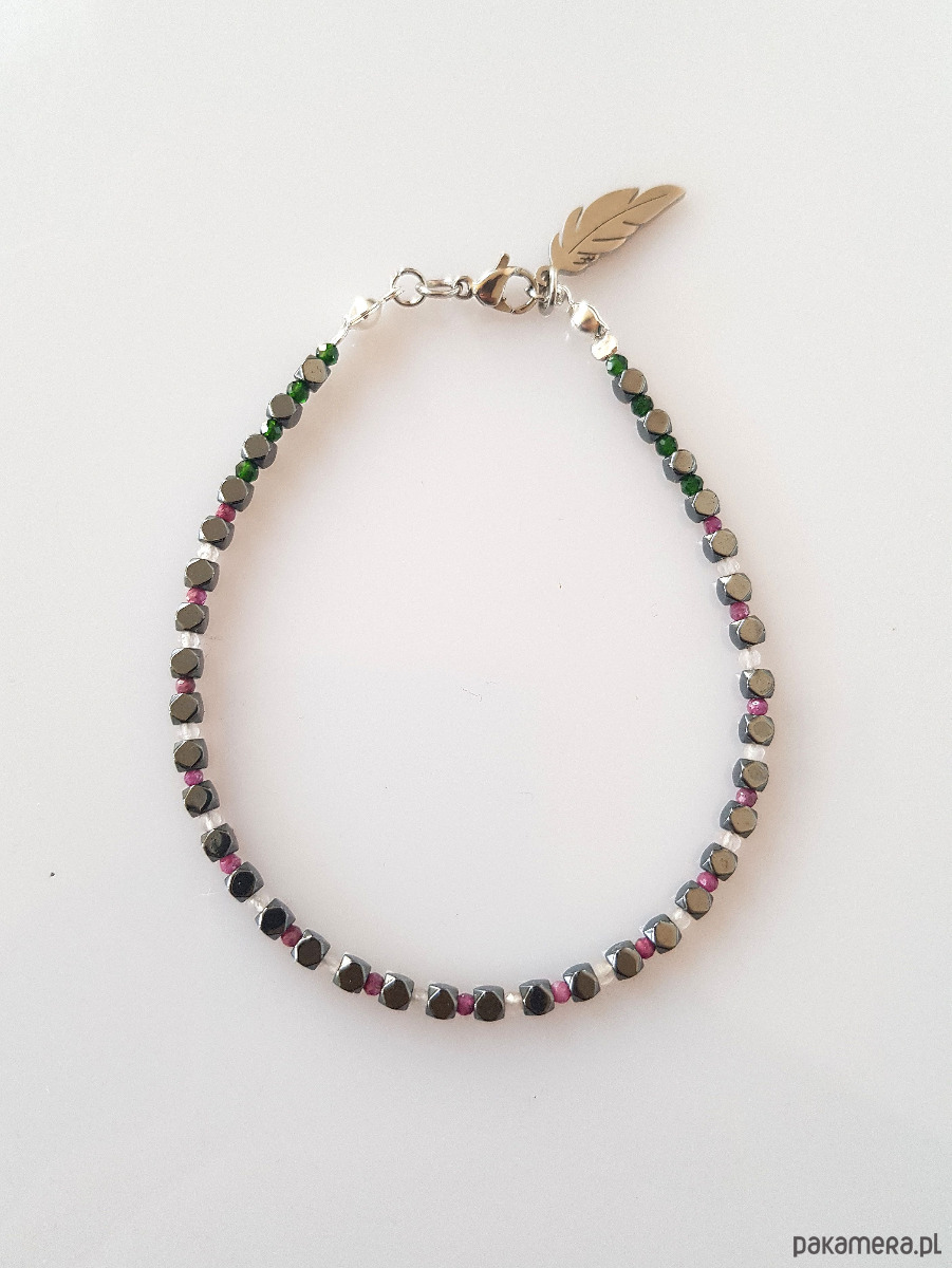 Wykonana z grafitowych kosteczek hematytu o ściętych rogach oraz drobnych fasetowanych kulek rubinu, kwarcu różowego i szmaragdu Nilu.