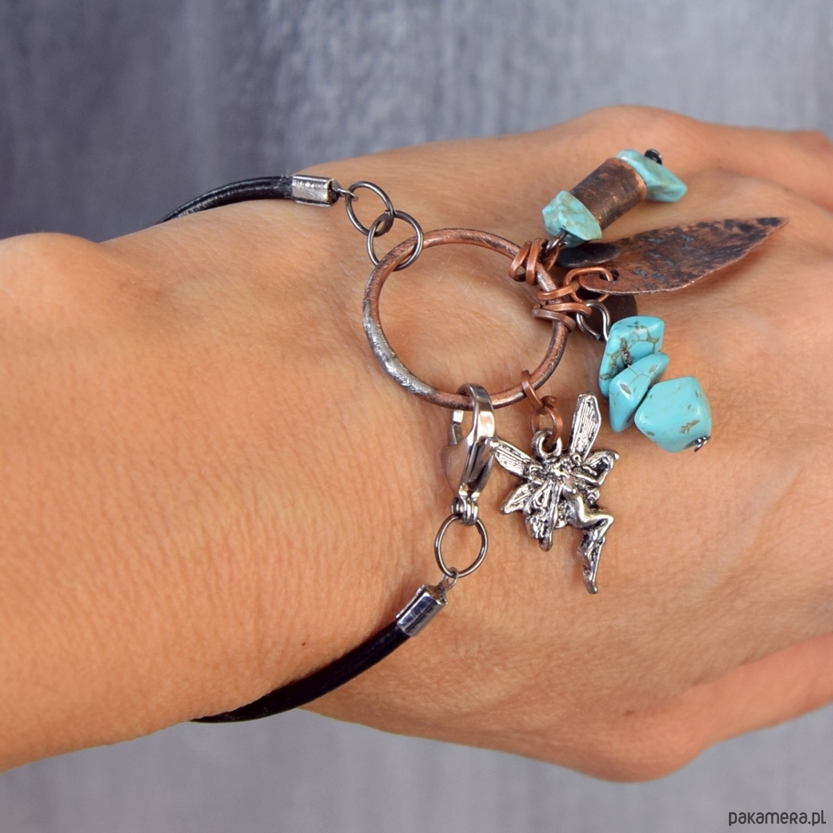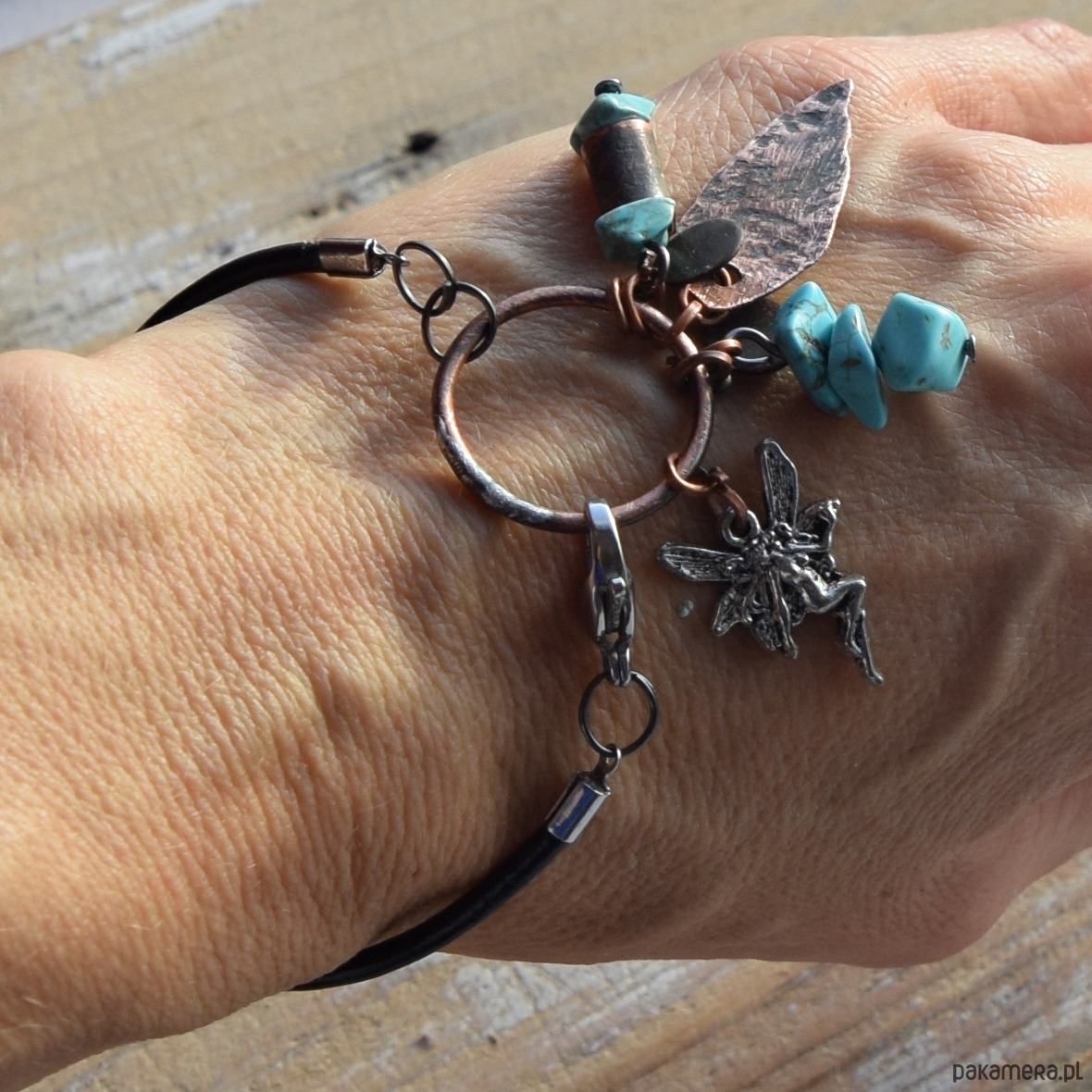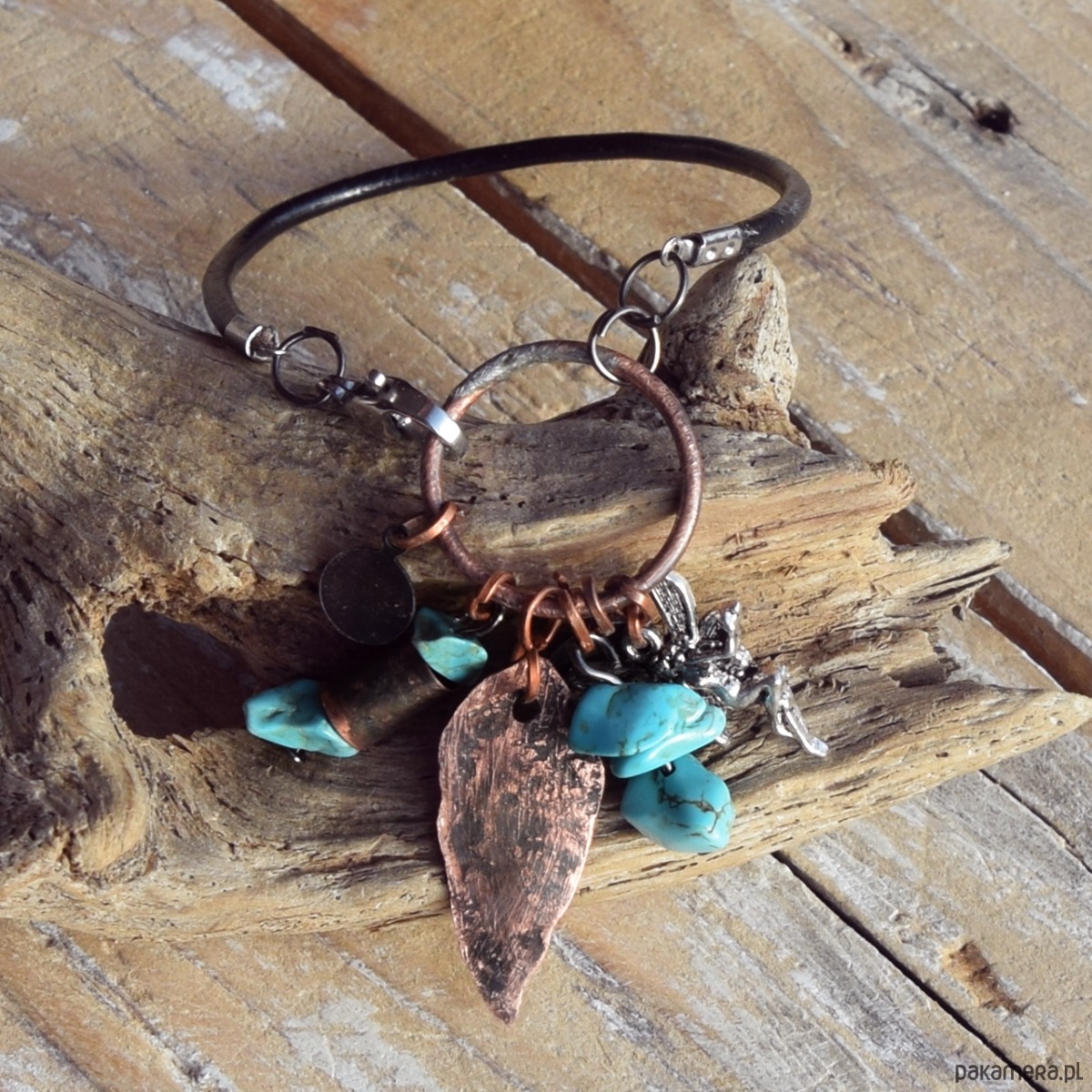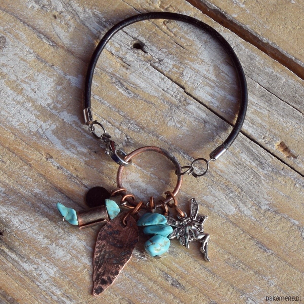Bransoletka wykonana z kutej, oksydowanej miedzi, nieregularnego turkusu, zawieszki metalowej i czarnego rzemienia.