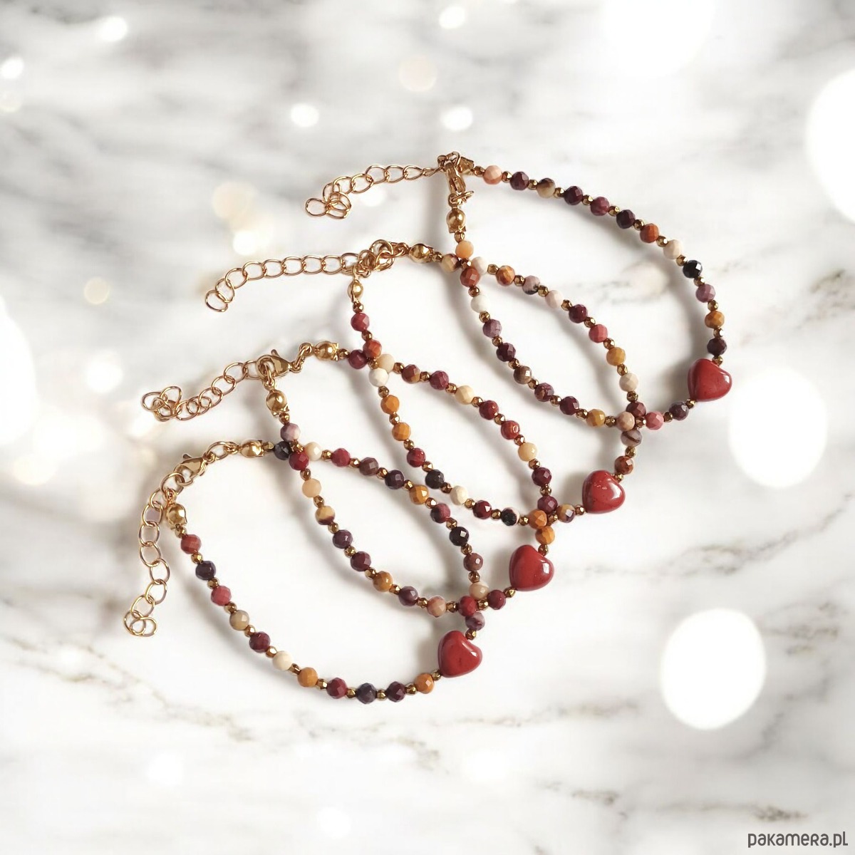 na solidnej lince stalowej (miękkiej) - została wykonana z serduszka z jaspisu królewskiego (odcienie ceglastej czerwieni) 8mm oraz fasetowanych kuleczek wielobarwnego mokaitu 4mm i drobniutkich kuleczek złotego hematytu.