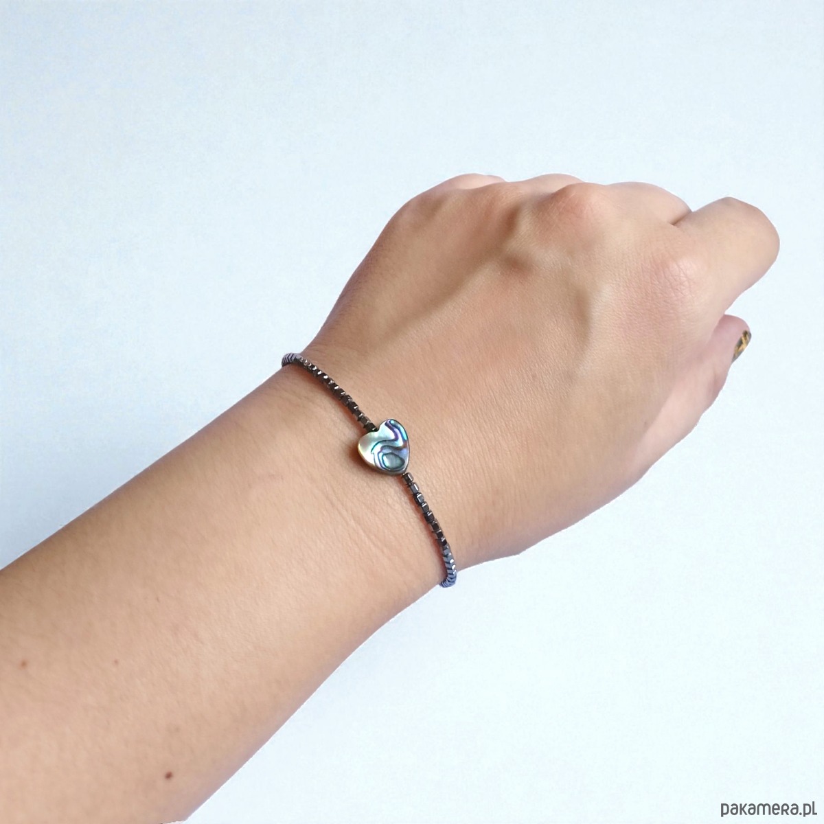 Bransoletka z serduszkiem : muszla PAUA, hematyt grafitowy