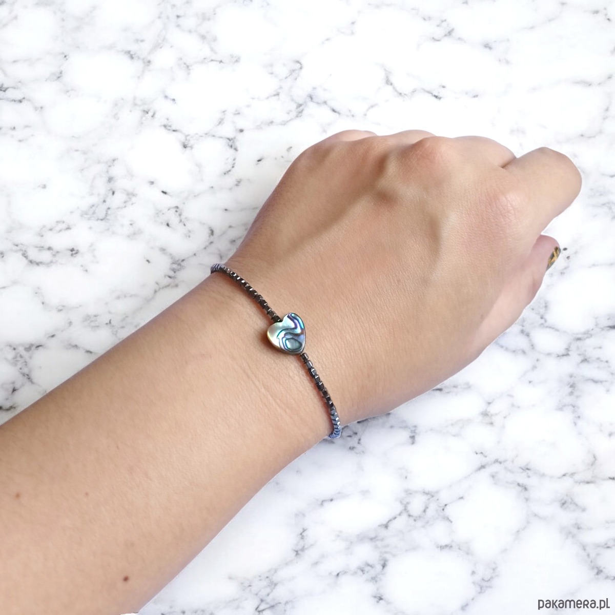 na solidnej lince stalowej (miękkiej) - została wykonana z serduszka z muszli paua 10mm (pięknie opalizuje w świetle naturalnym i sztucznym! ) oraz drobniutkich kosteczek hematytu grafitowego 2mm o ciekawym szlifie.