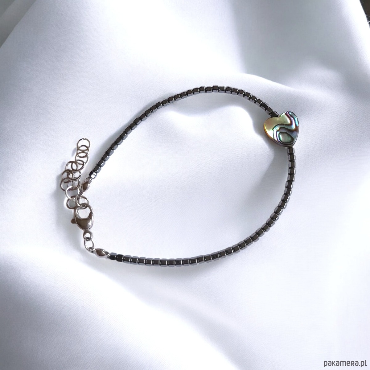 Bransoletka z serduszkiem : muszla PAUA, hematyt grafitowy