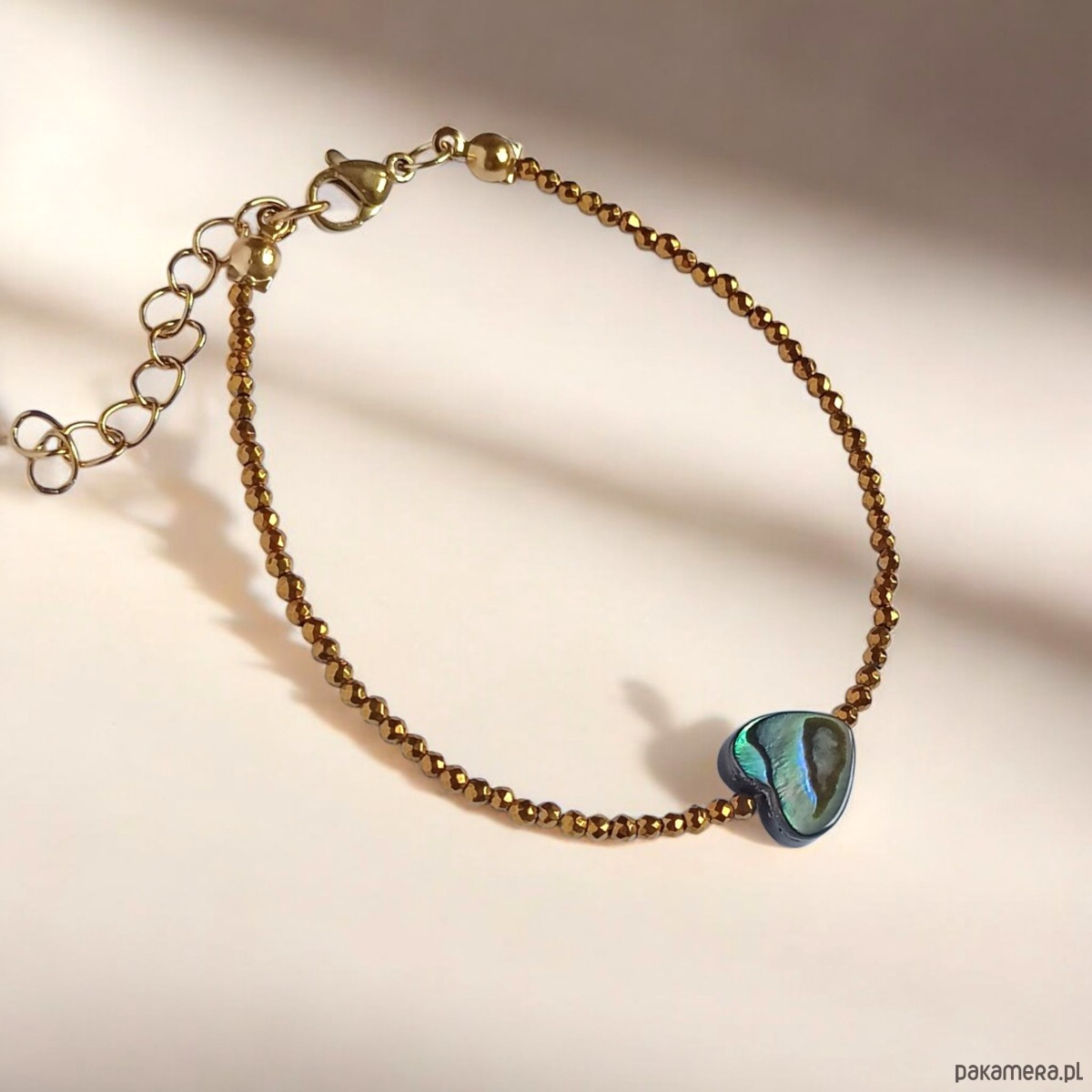 Bransoletka z serduszkiem : muszla PAUA, hematyt złoty