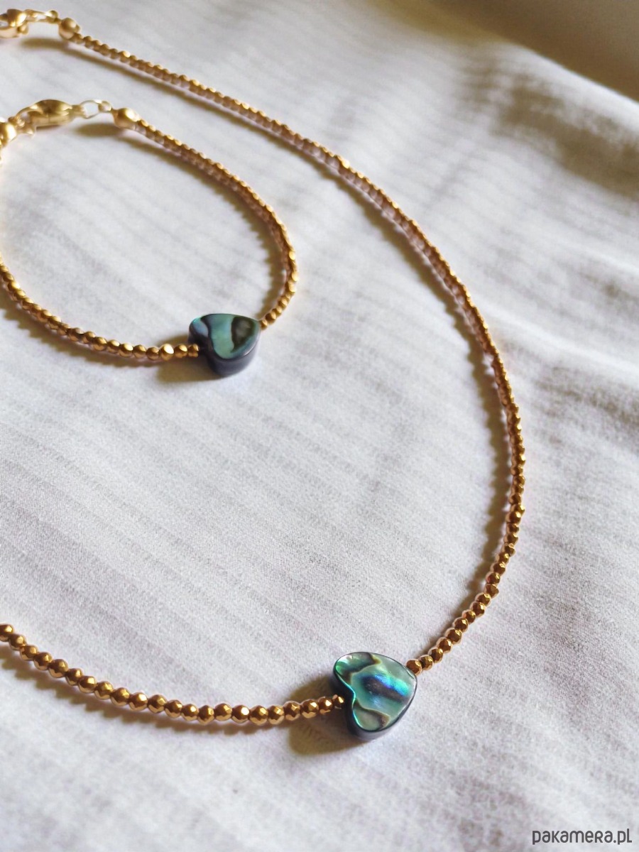 na solidnej lince stalowej (miękkiej) - została wykonana z serduszka z muszli paua 10mm (pięknie opalizuje w świetle naturalnym i sztucznym! ) oraz drobniutkich kuleczek fasetowanego hematytu złotego (niecałe 2mm).