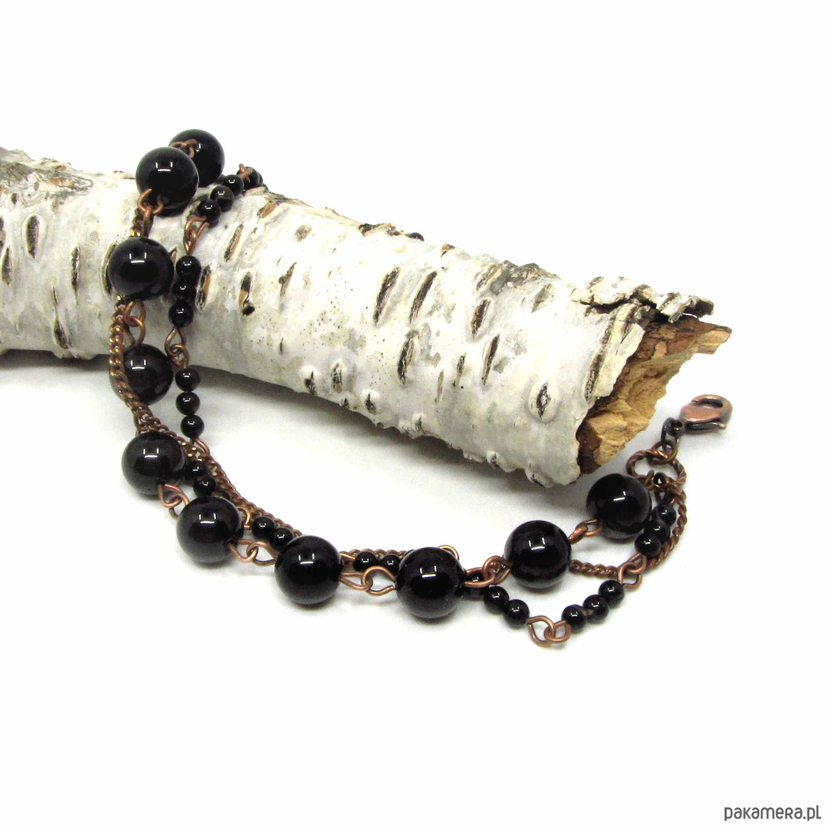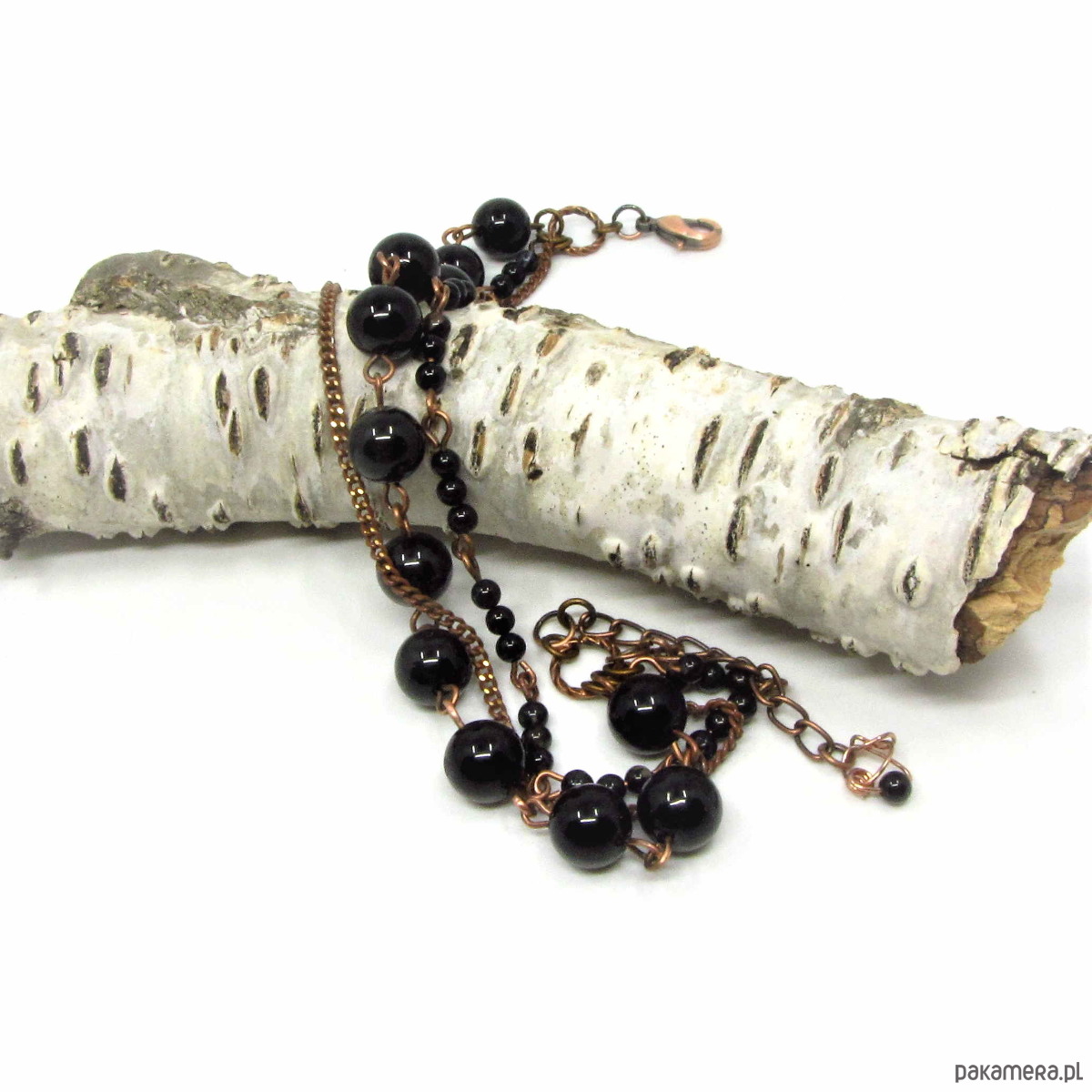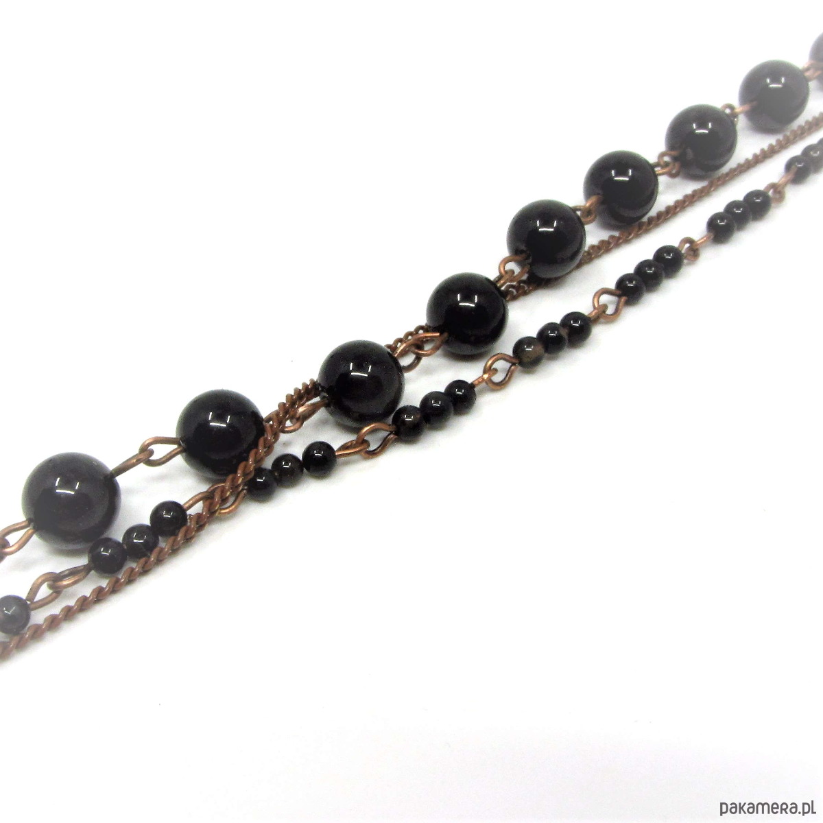 Delikatna bransoletka wykonana w miedzi z wysokiej jakości turmalinów 8mm i drobnych kuleczek czarnego onyksu. Bransoletka oksydowana i przetarta. Całkowita długość bransoletki około 22,50cm plus 3,5cm