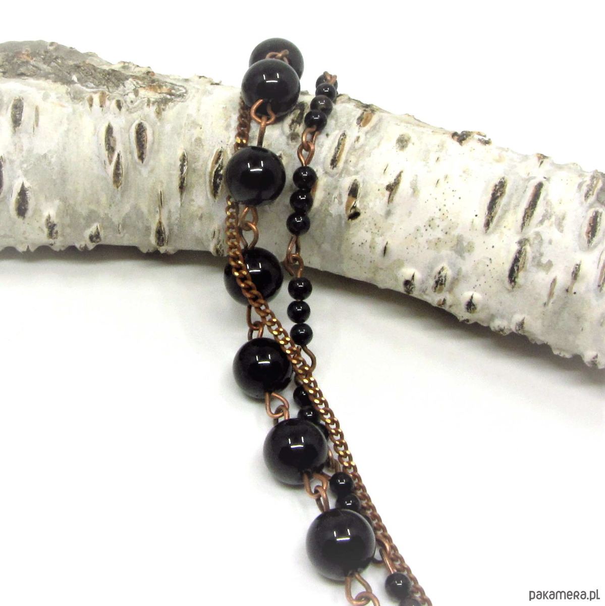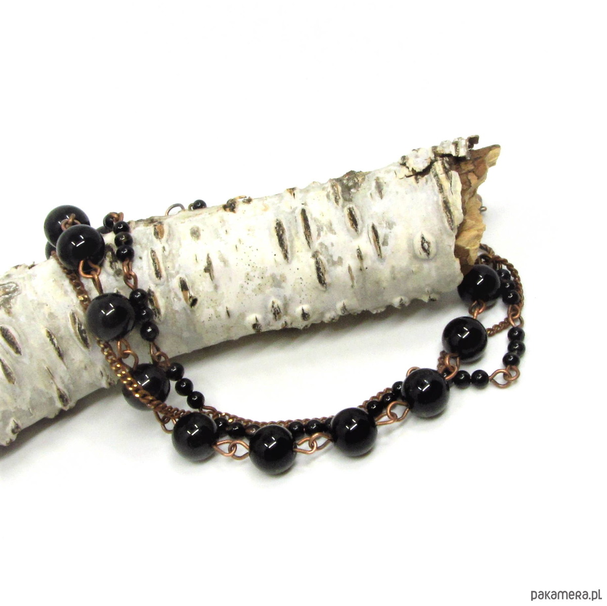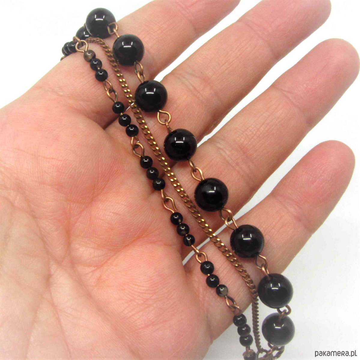 Delikatna bransoletka wykonana w miedzi z wysokiej jakości turmalinów 8mm i drobnych kuleczek czarnego onyksu. Bransoletka oksydowana i przetarta. Całkowita długość bransoletki około 22,50cm plus 3,5cm