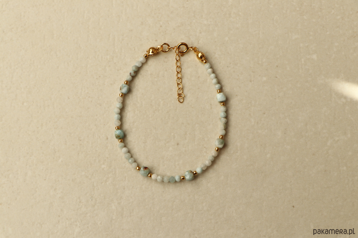 Wykończenie bransoletki stanowi wysokiej jakości srebro próby 925, które zostało pokryte warstwą złota. To połączenie nadaje biżuterii ciepłego blasku i luksusowego charakteru, pięknie kontrastując z chłodną barwą larimaru.