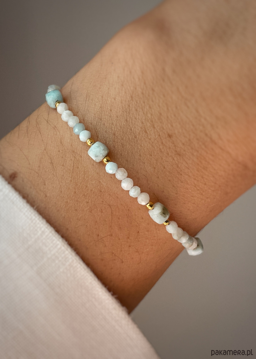 Materiał: wytrzymała stalowa linka jubilerskaOdkryj subtelne piękno naturalnego larimaru w tej wyjątkowej bransoletce. Starannie wyselekcjonowane kamienie larimaru, znane ze swoich hipnotyzujących, błękitno-białych odcieni przywodzących na myśl karaibskie wody, zostały nawleczone na wytrzymałą, stalową linkę jubilerską, gwarantując trwałość i komfort noszenia.