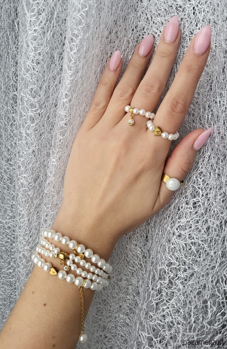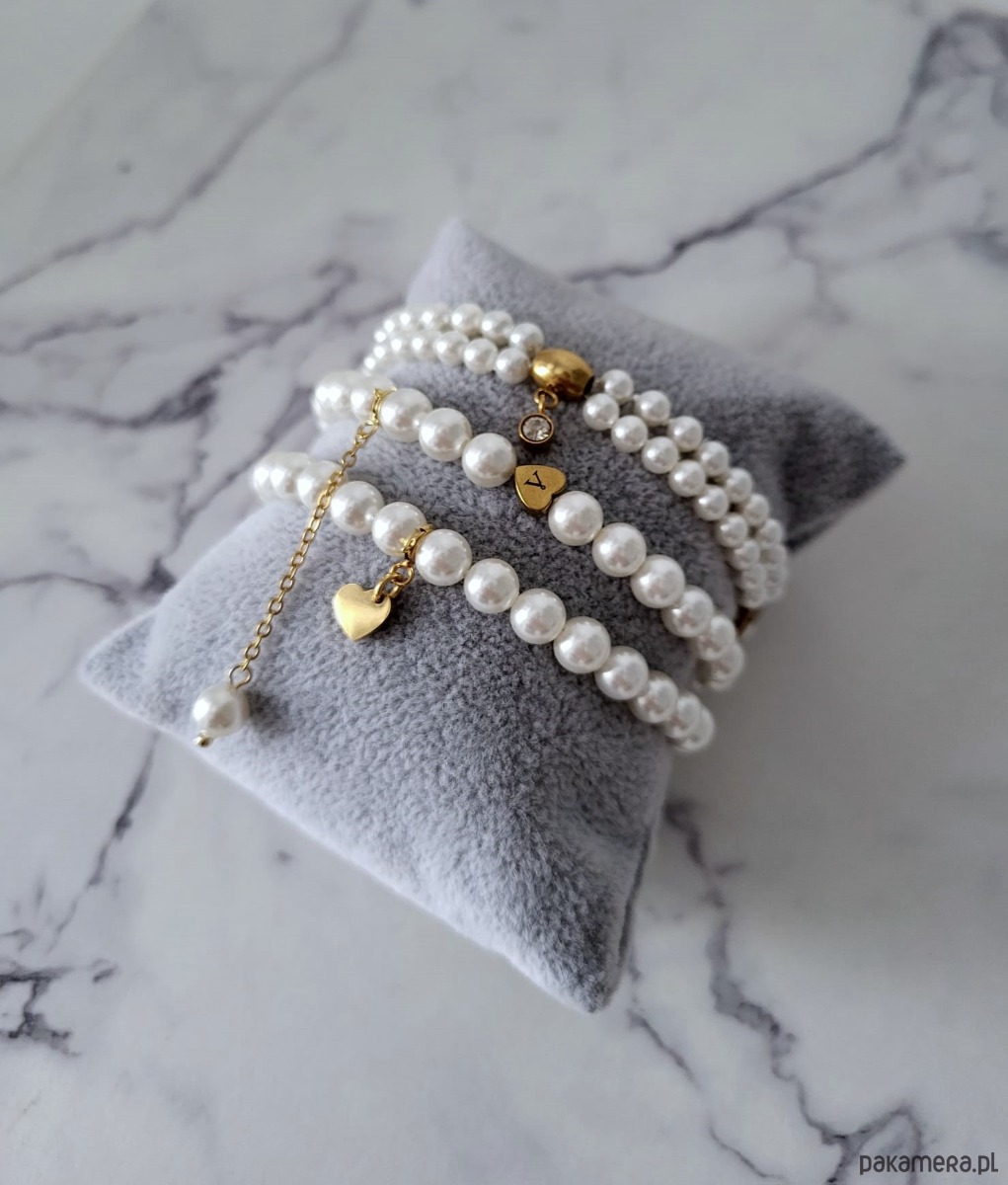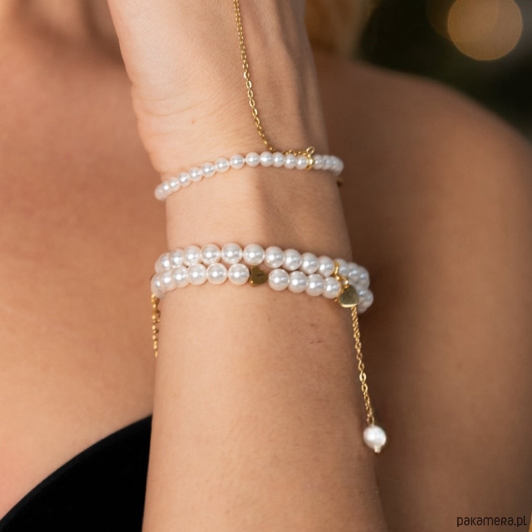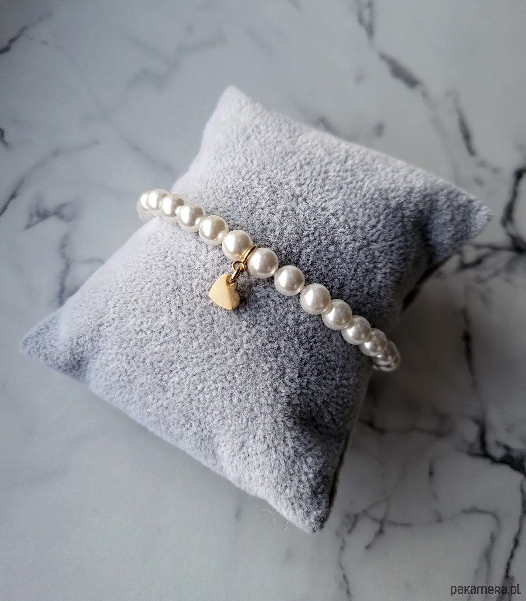 Bransoletka z pereł z zawieszką w kształcie serduszka, wykonana z perły muszlowej w połączeniu z elementami ze stali szlachetnej. Serduszko dopinane jest do bransoletki za pomocą federinga, dzięki czemu można nosić bransoletkę również w wersji bez zawieszki. Bransoletka zapinana jest na karabińczyk, z możliwością regulacji, dzięki dodatkowej przedłużce (+5 cm), z logo Afroditte na jej końcu. Perły nawleczone są na trwały sznurek nylonowy w kolorze białym. Całość prezentuje się elegancko, luksusowo i klasycznie.