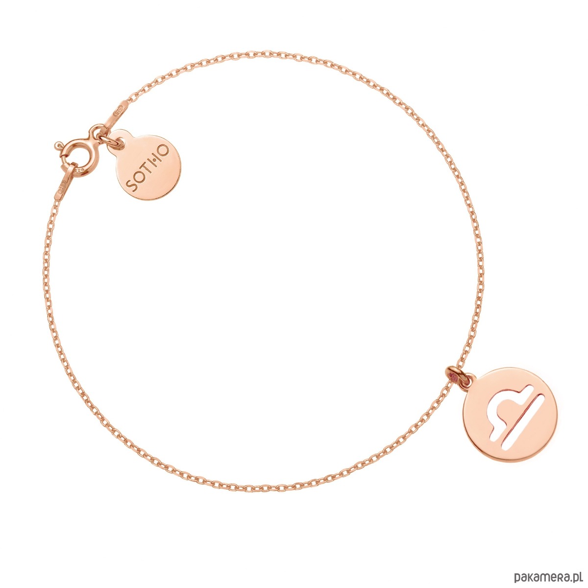 Złota bransoletka łańcuszkowa zdobiona znakiem zodiaku Wagi i zawieszką z logo marki. Całość wykonana ze srebra 925 powlekanego 18 karatowym różowym złotem.