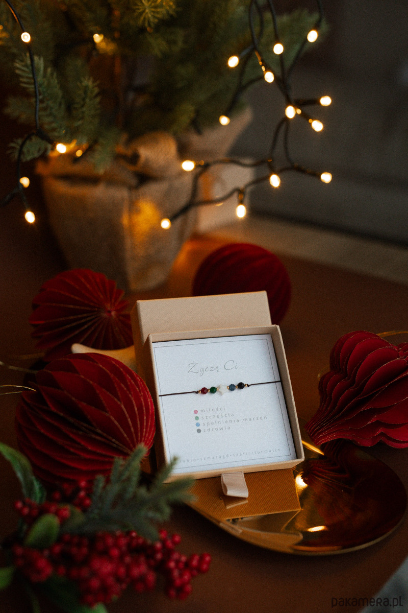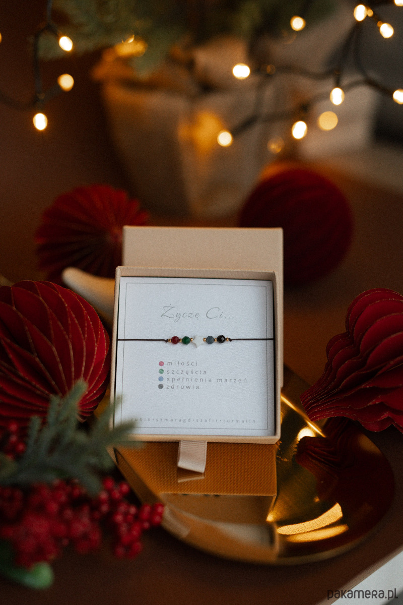 Każda bransoletka zapakowana jest w pudełko jubilerskie razem z karteczką z życzeniami.