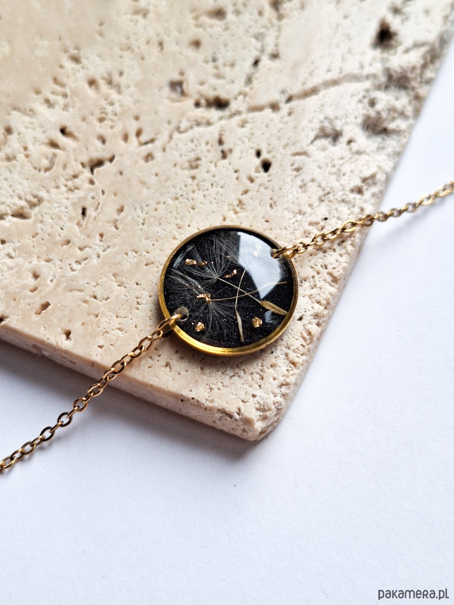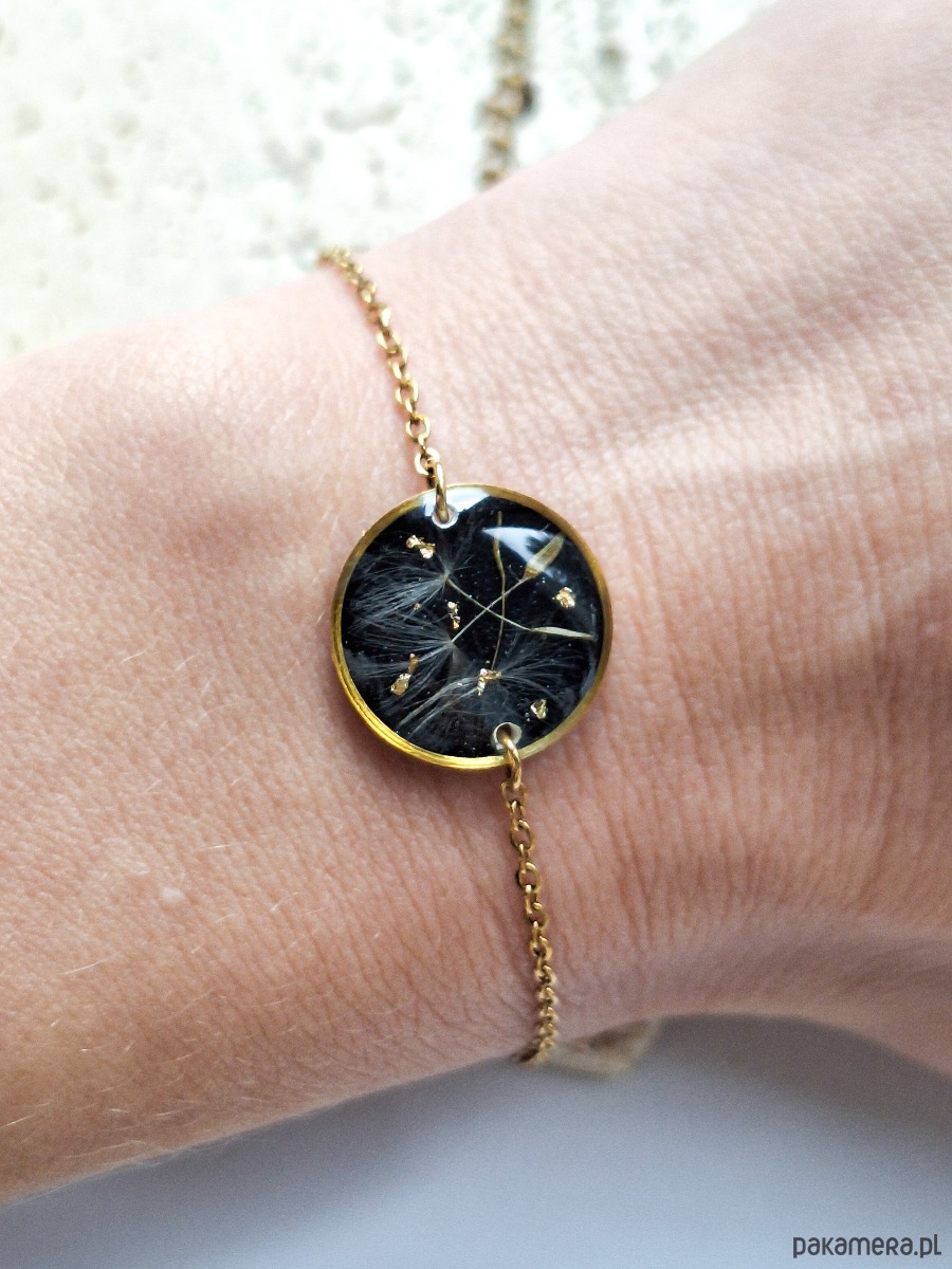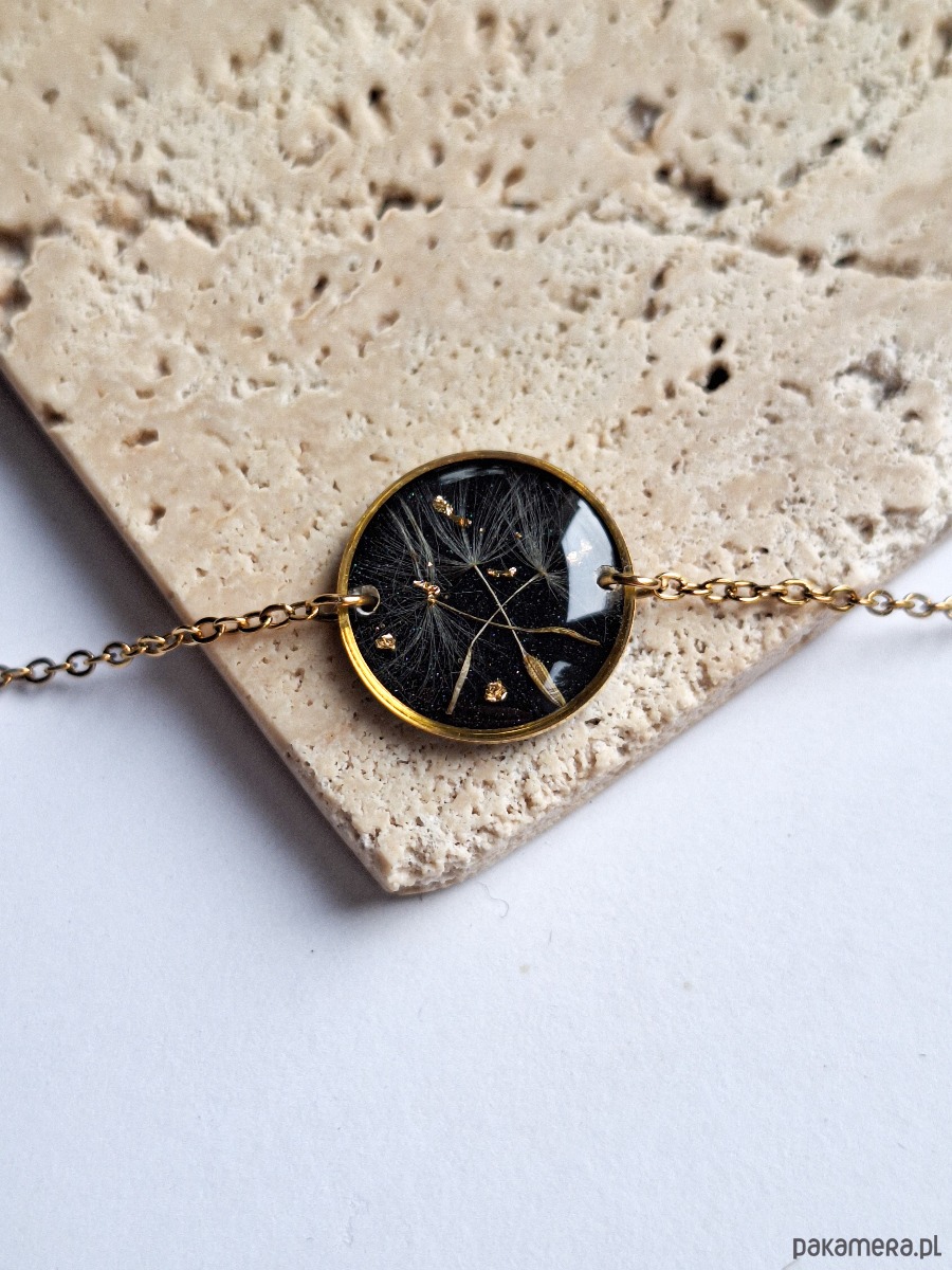 Urocza bransoletka w kształcie kółka z zatopionymi nasionami dmuchawca i płatkami złota na czarnym połyskującym tle. Wykonana z wysokiej klasy żywicy, która nie zmienia koloru pod wpływem promieniowania uv oraz wysokiej jakości stali chirurgicznej.