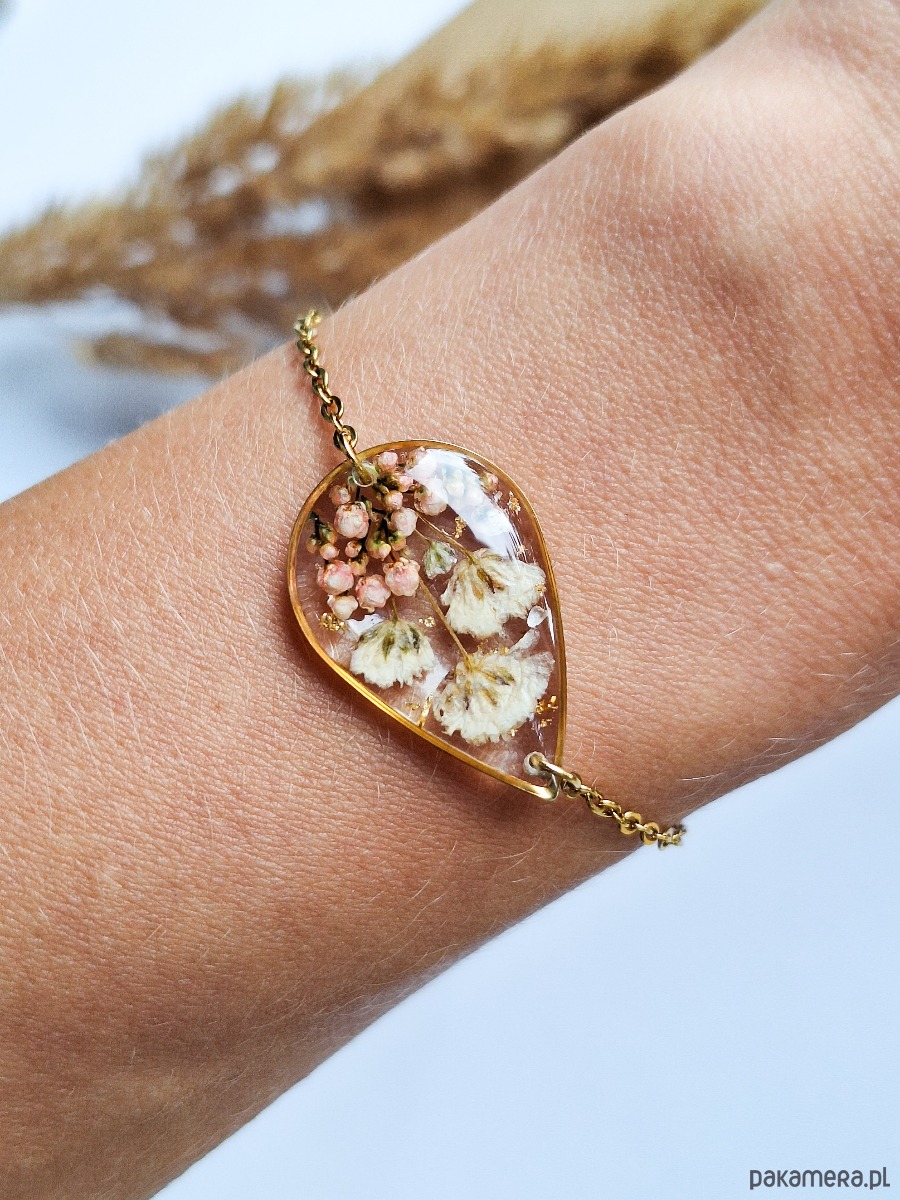 Urocza bransoletka w kształcie łezki z zatopionymi kwiatami białej gipsówki, różowego ozothumnusa i płatkami złota. Wykonana z wysokiej klasy żywicy, która nie zmienia koloru pod wpływem promieniowania uv oraz wysokiej jakości stali chirurgicznej.
