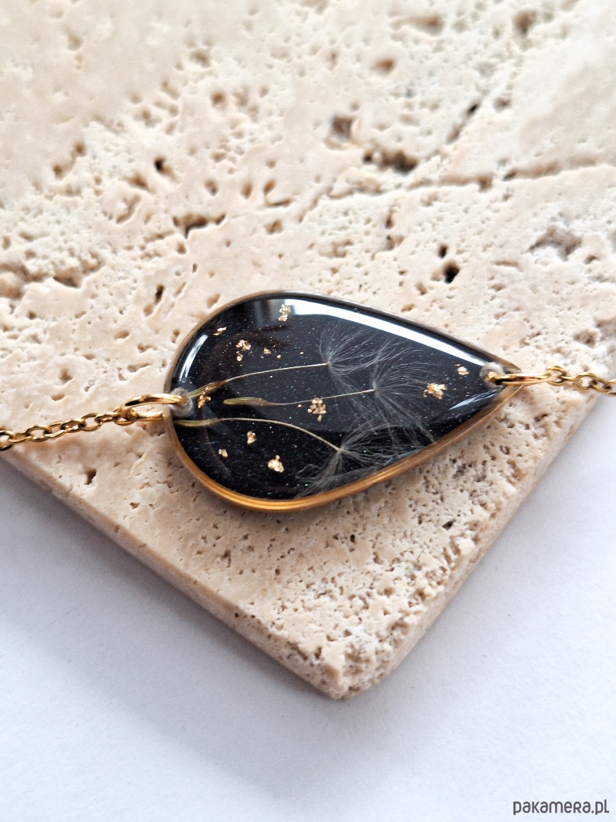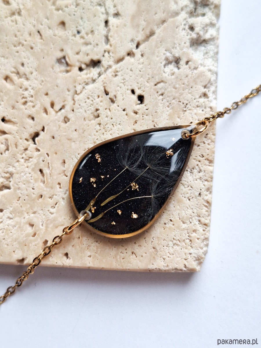 Urocza bransoletka w kształcie łezki z zatopionymi nasionami dmuchawca i płatkami złota na czarnym połyskującym tle. Wykonana z wysokiej klasy żywicy, która nie zmienia koloru pod wpływem promieniowania uv oraz wysokiej jakości stali chirurgicznej.