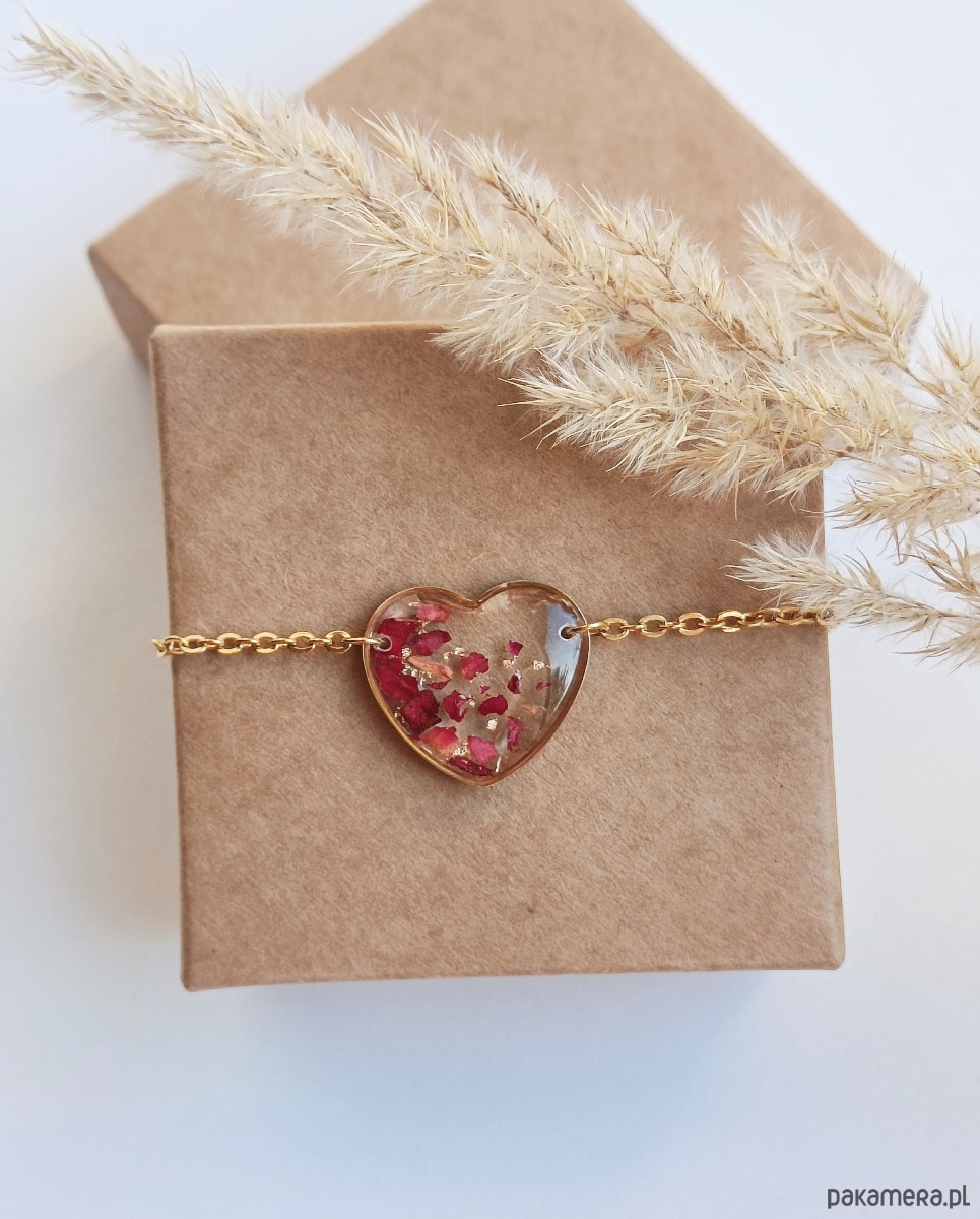 Urocza bransoletka z zatopionymi płatkami róży i drobinkami złota. Wykonana z wysokiej klasy żywicy, która nie zmienia koloru pod wpływem promieniowania uv oraz wysokiej jakości stali chirurgicznej.