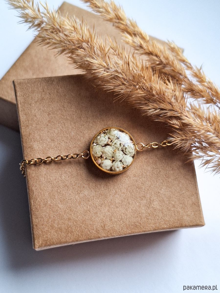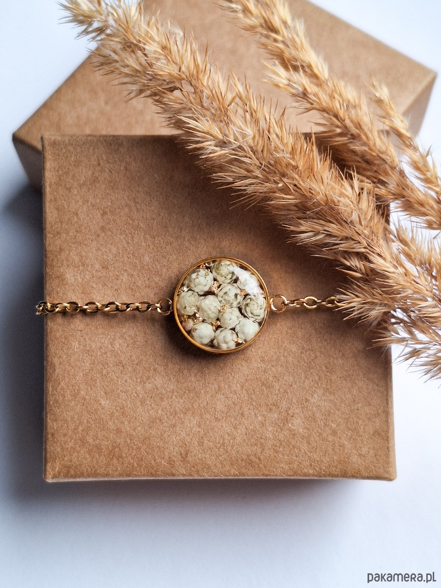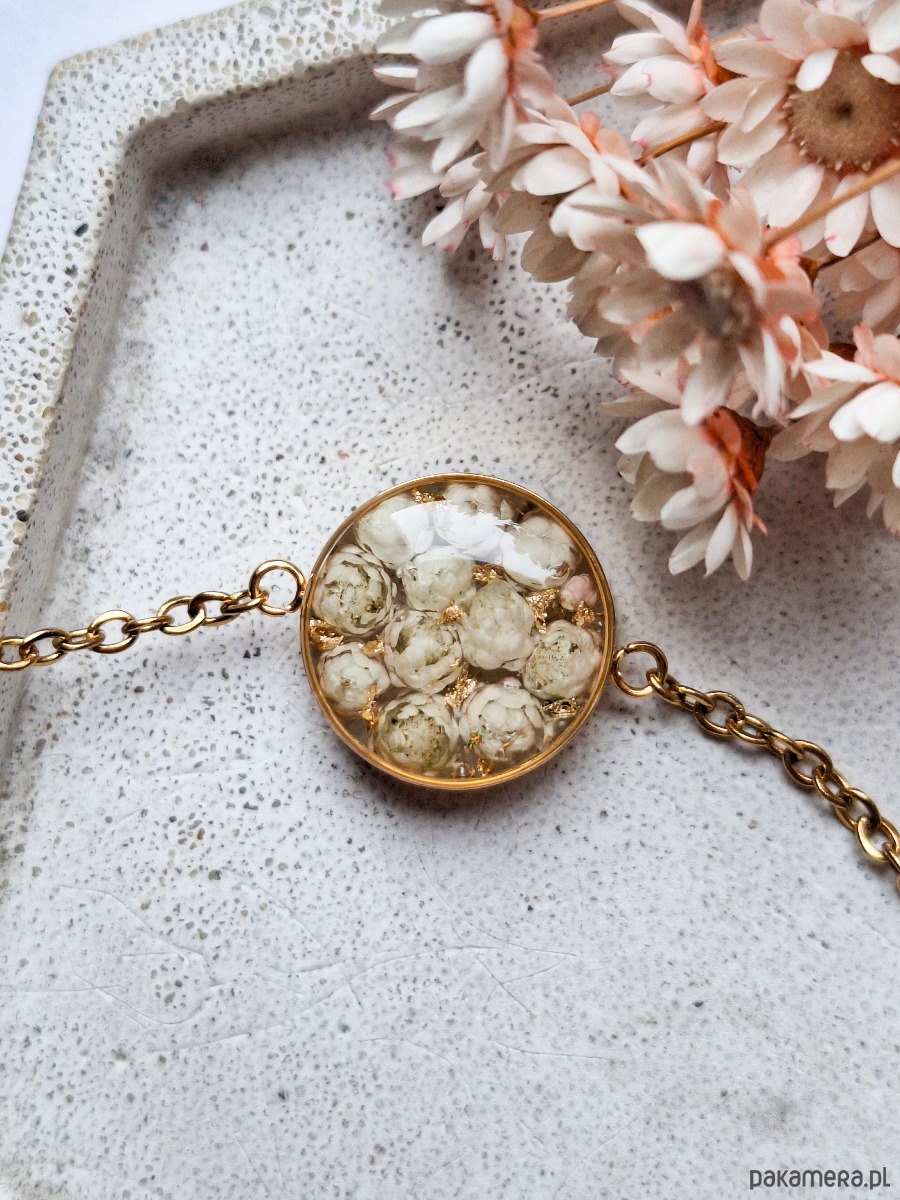 Urocza bransoletka z kwiatami białego ozothumnusa i płatkami złota. Wykonana z wysokiej klasy żywicy, która nie zmienia koloru pod wpływem promieniowania uv oraz wysokiej jakości stali chirurgicznej.