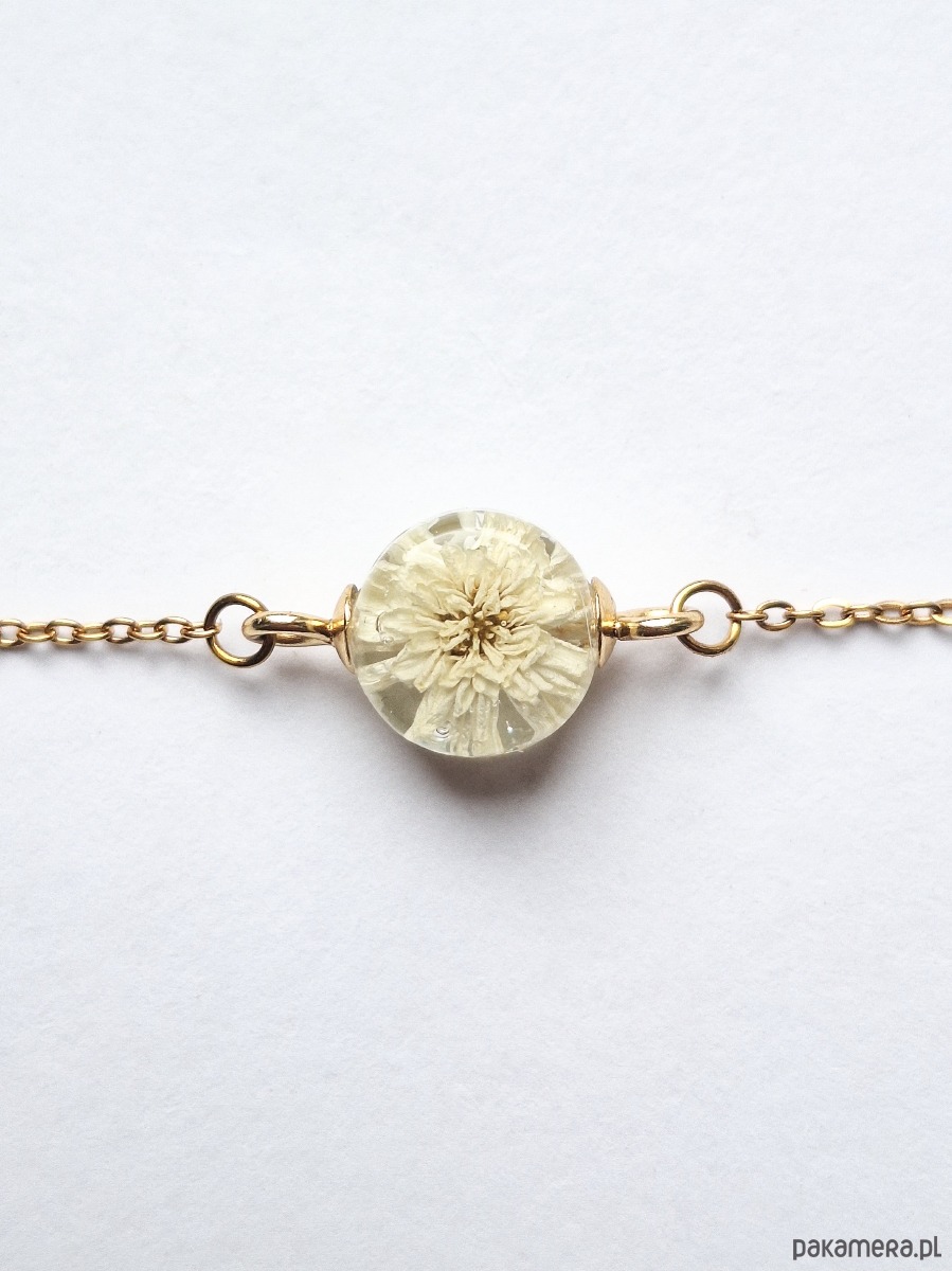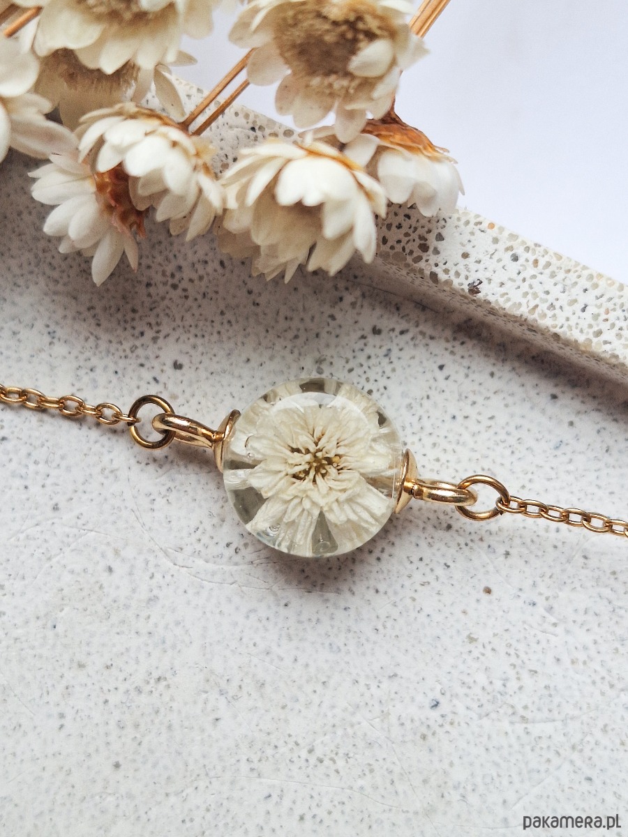 Urocza bransoletka z kwiatem krwawnika. Wykonana z wysokiej klasy żywicy, która nie zmienia koloru pod wpływem promieniowania uv oraz wysokiej jakości stali chirurgicznej.