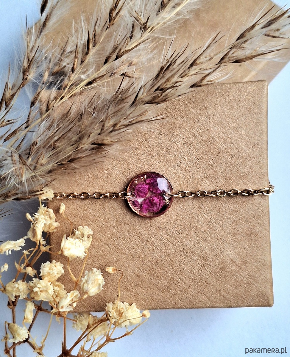 Urocza bransoletka z zatopionymi kwiatami gipsówki w kolorze fioletowym i płatkami złota. Wykonana z wysokiej klasy żywicy, która nie zmienia koloru pod wpływem promieniowania uv oraz wysokiej jakości stali chirurgicznej.