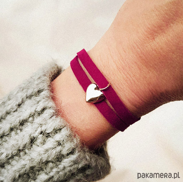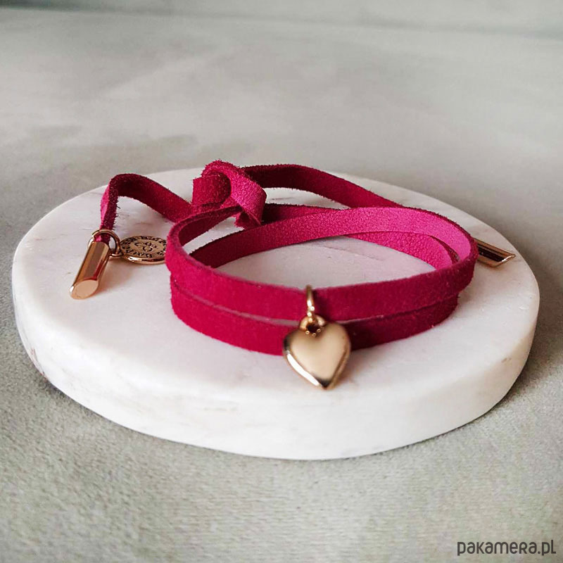 Bransoletka zamszowa z serduszkiem fuksja