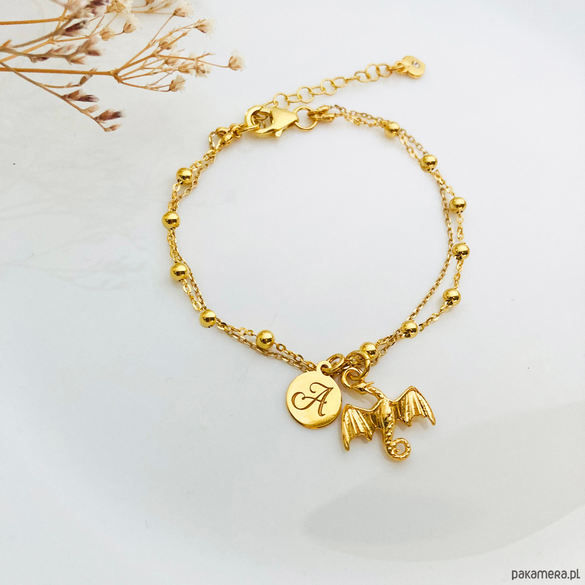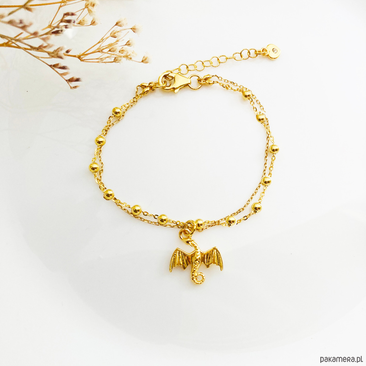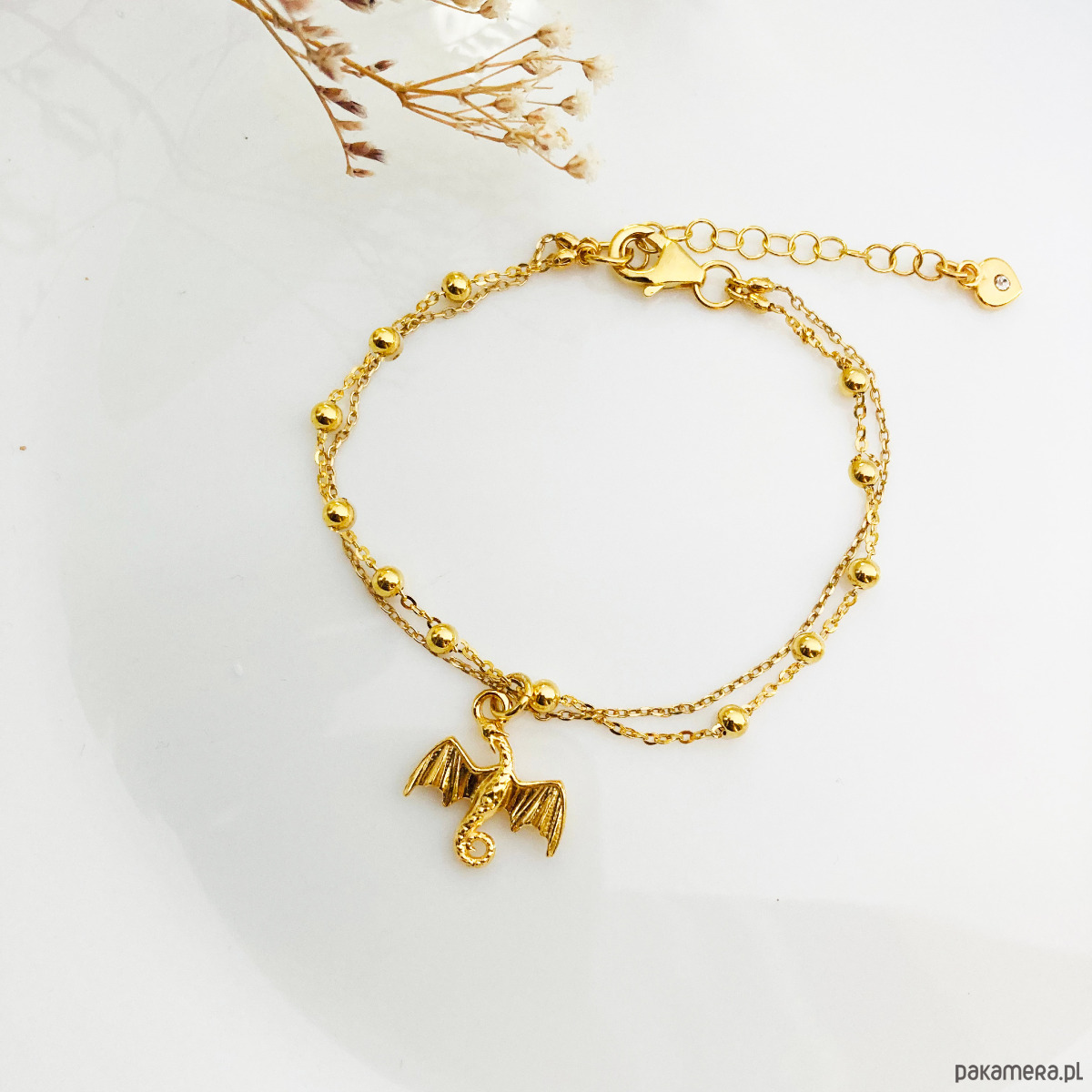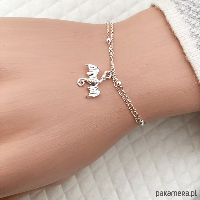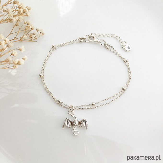 Delikatna bransoletka na podwójnym łańcuszku z zawieszką smokiem.