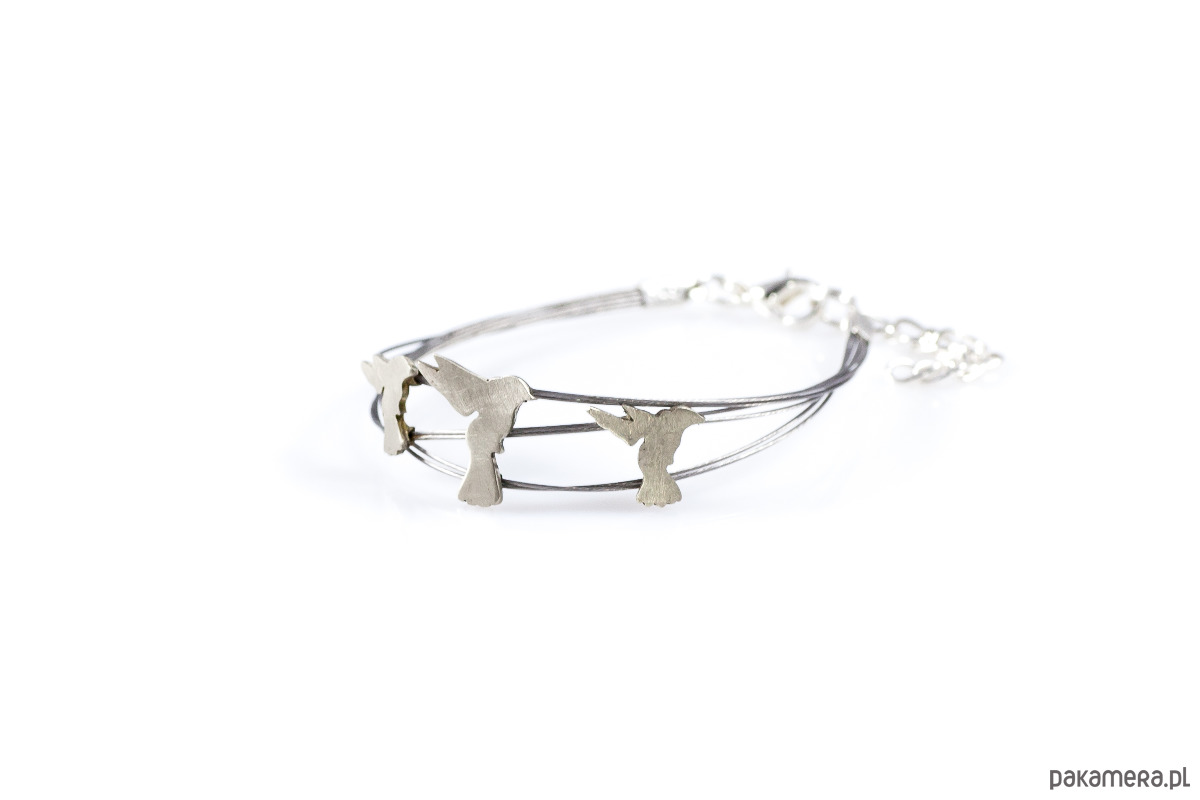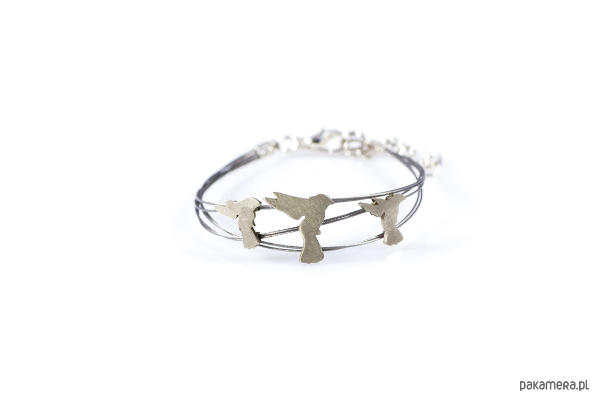 Koliberki wielkości około 1- 1,5 cm, przymocowane do stalowych linek o długości około 14 cm. Przy zapięciu jest