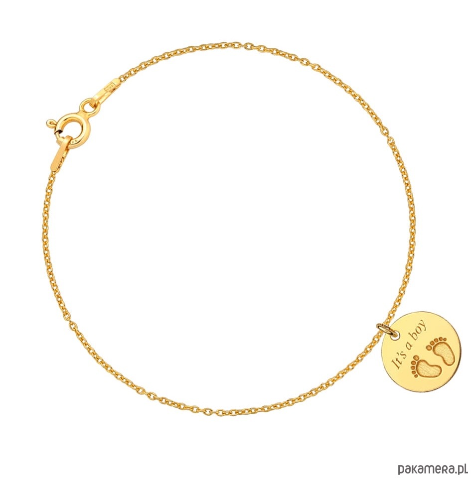 Bransoletka z grawerem wykonana z delikatnego łańcuszka oraz okrągłej zawieszki ze stópkami dziecka oraz napisem "It's a boy".